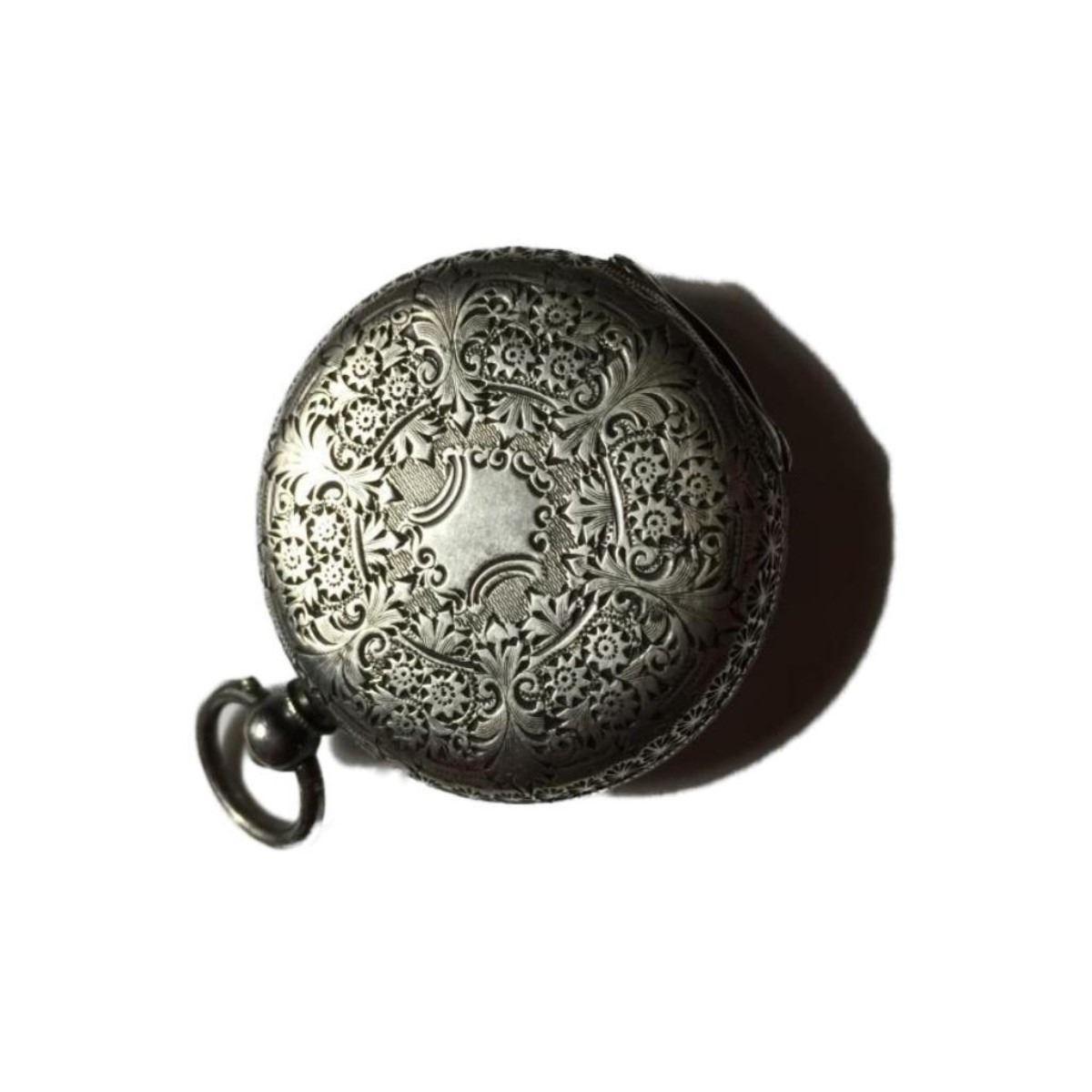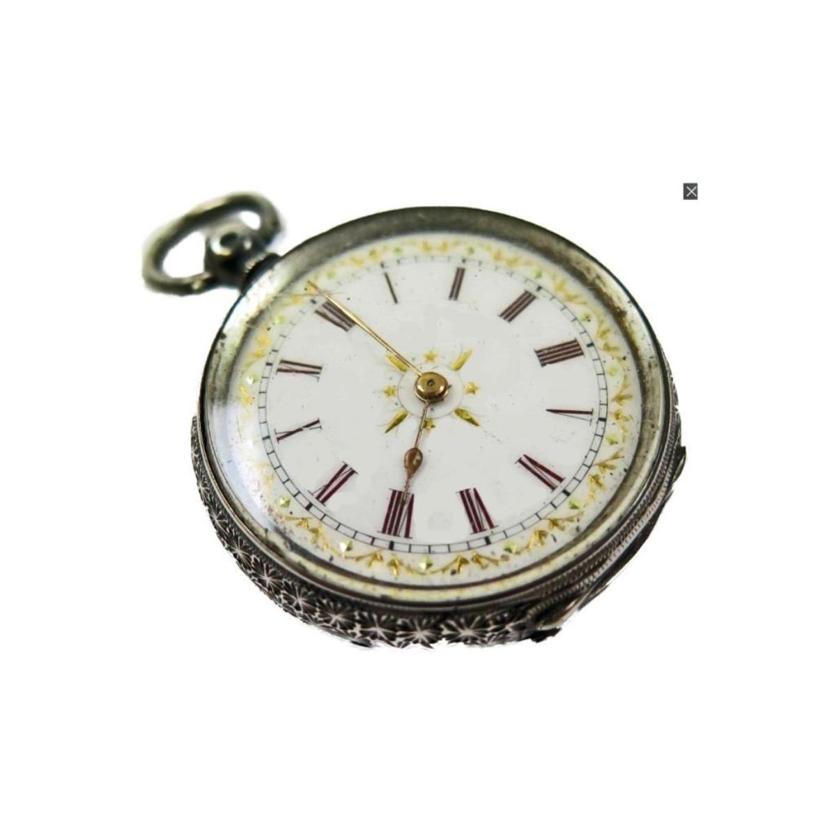 Late 19th century ladies Swiss silver ( stamped 0.935 ) with Roman face, copper numerals & hands, applied gold decoration & outer minute track. Highly engraved floral design case includes center shield for
