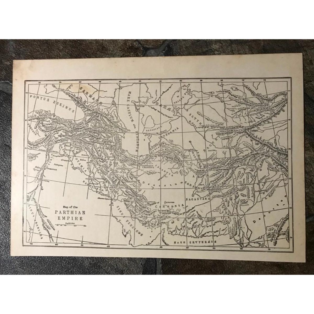 Black & white "Map of the Parthian Empire", page from a 19th-century history book, "Universal History - The Ancient World." Ancient Iran, Persian empire. 7" X 10".Â