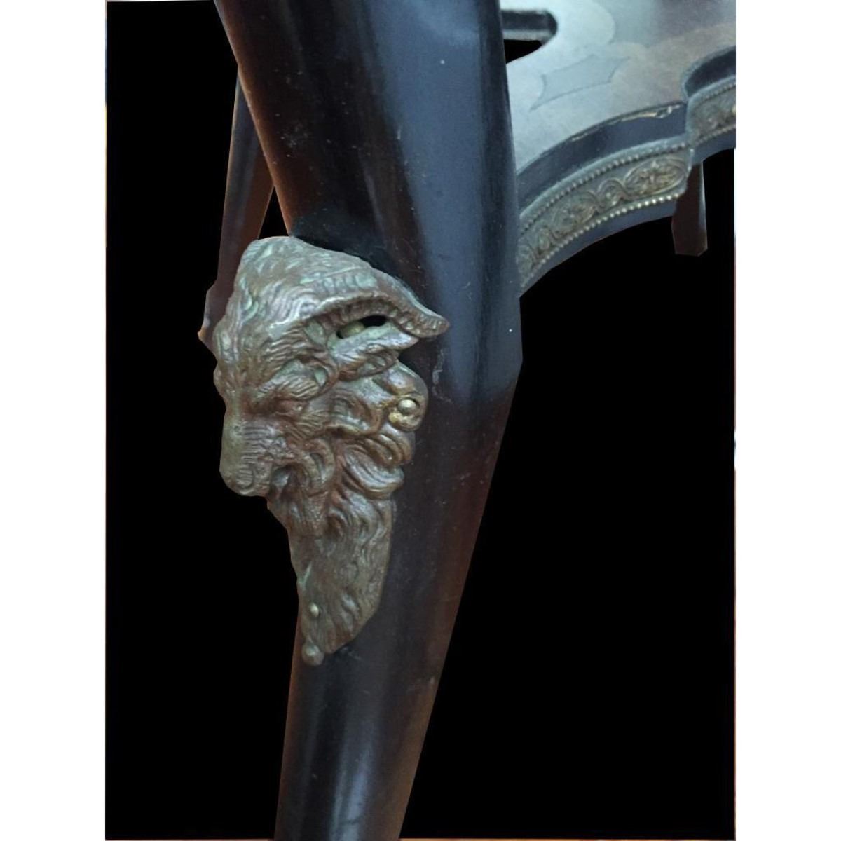 Napoleon III style, inlaid mahogany, bronze-mounted Gueridon, late 19th century, scalloped top with inset faux marble encompassed by beading & marquetry over one-drawer frieze with mirroring inlay.Splayed legs with bronze figural mounts of hounds.