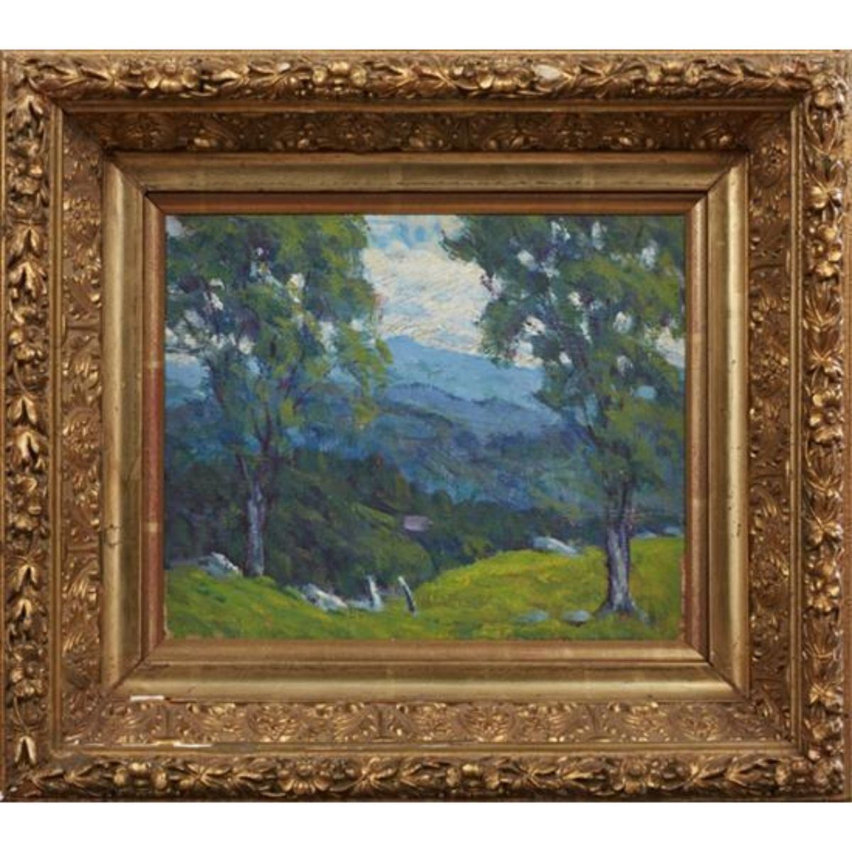 Attributed to James McRickard (1872 - ), "Landscape," late 19th Century, double-sided oil on board, unsigned, presented in a period gilt & gesso frame, 7 3/4"H X 9 1/2" W. Provenance: Private Collection of a local Antiquarian, New Orleans, Louisiana. - 10597-051918-IN-00261