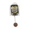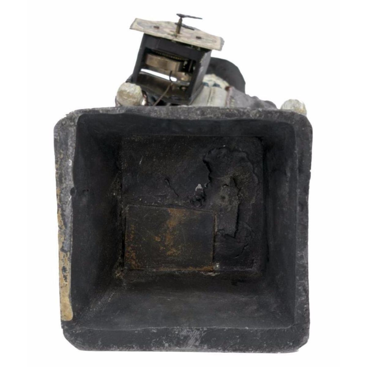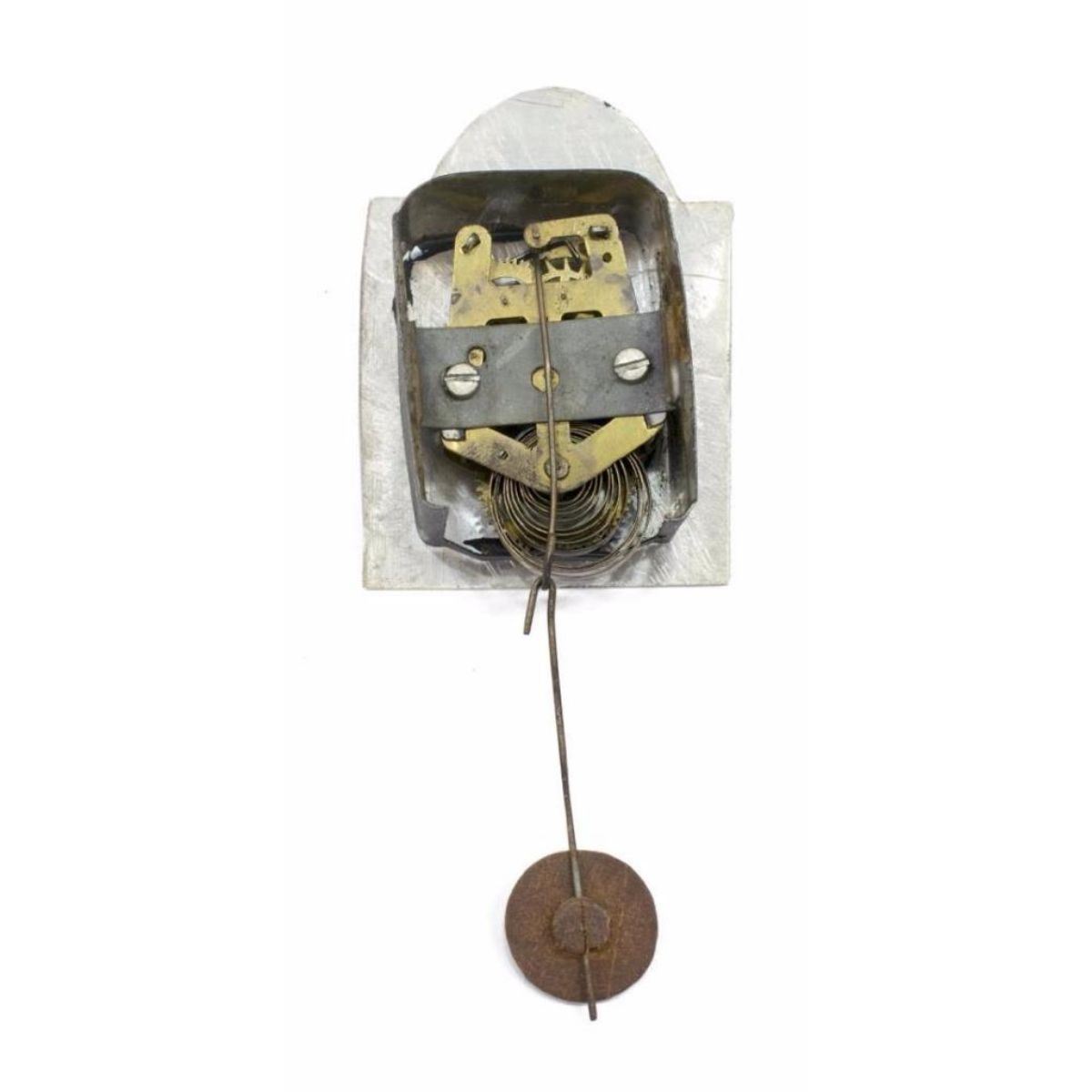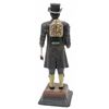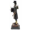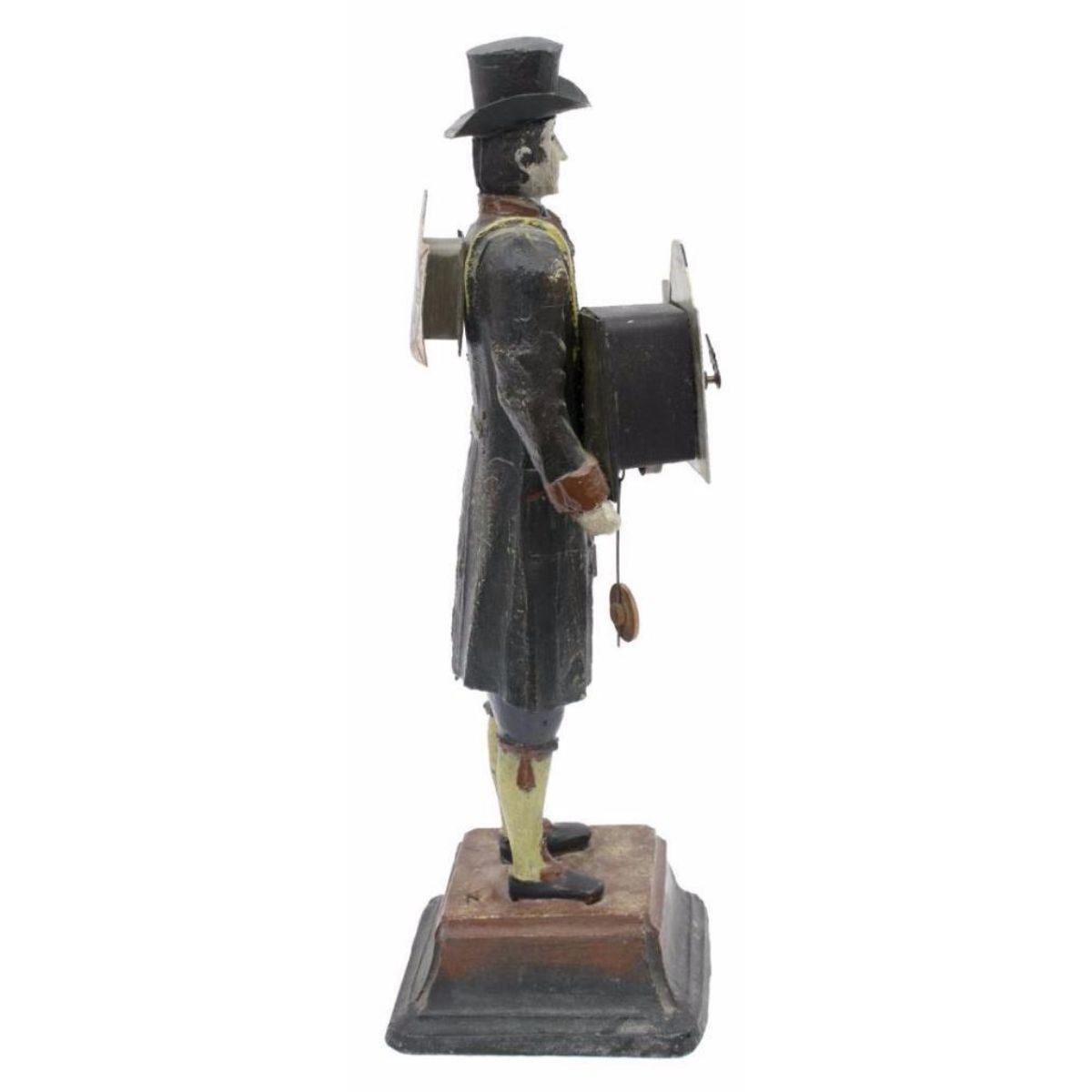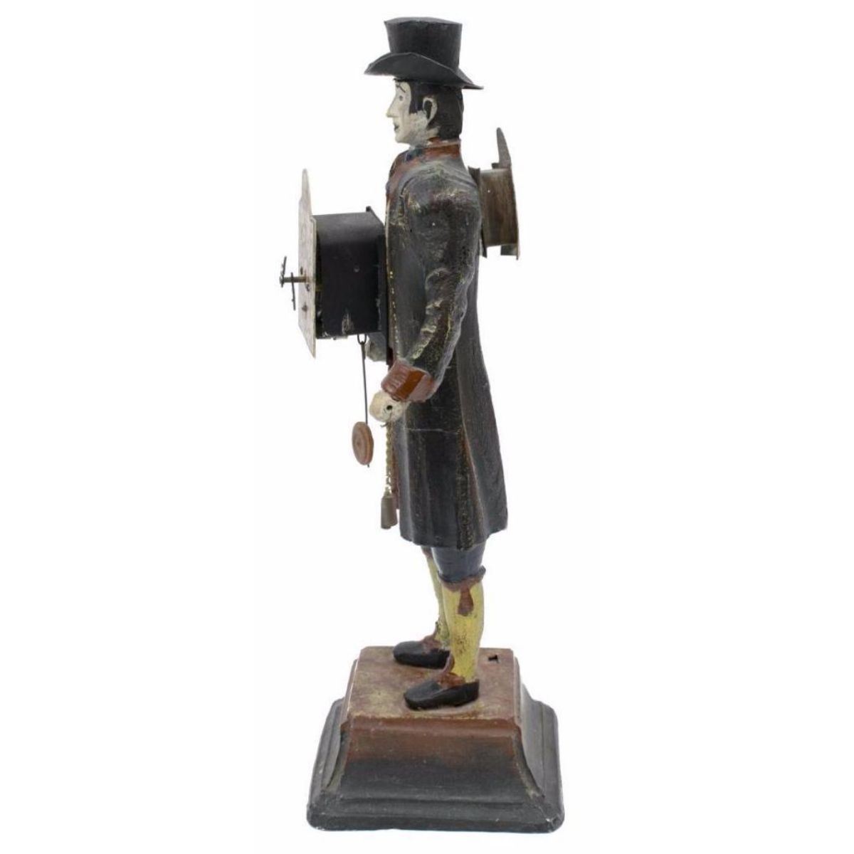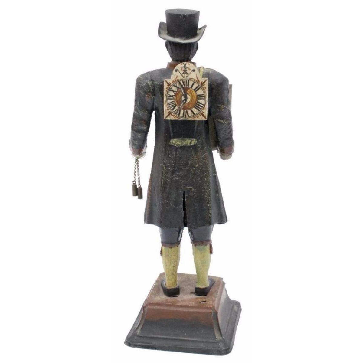 Late 19th Century figurative polychrome metal clock, figure of a Wag on the Wall clock, held by standing figure of a peddler, gent in 18th Century dress in top hat, with a clock on his back and holding another to the front with hanging pendulum, chain with weight in his left hand, on a cast metal base. *** older patched restoration underfoot, some loss, later key, not operating at this time, 14 1/2" H X 4 1/2" W X 4 1/2" D. 9lbs.