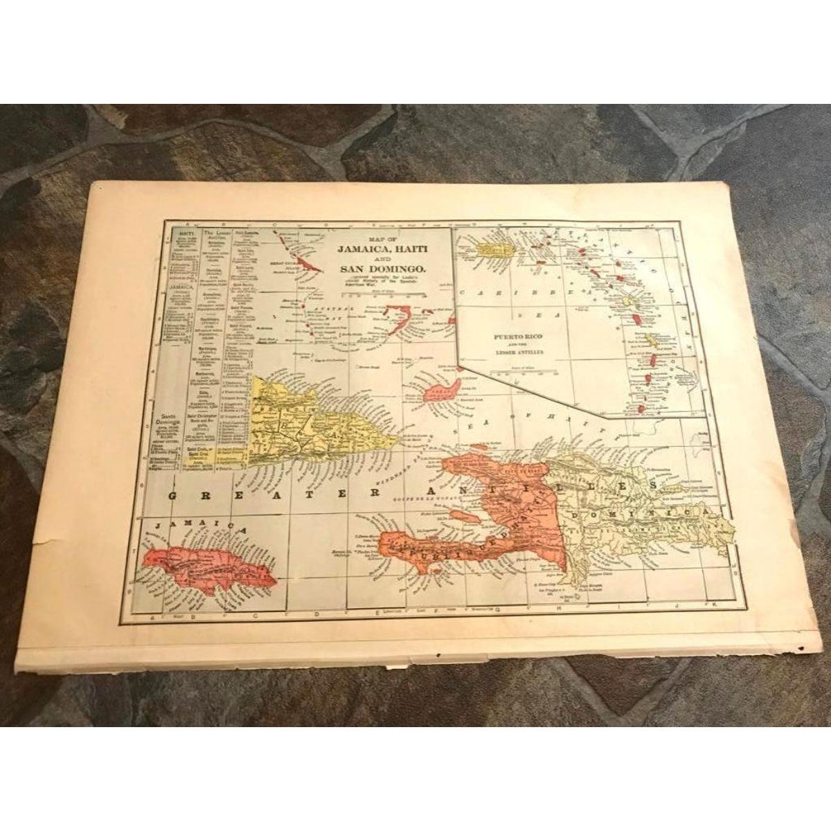 Late 19th Century colored map of Porto Rico from Leslie's Official History of The Spanish American War. On the reverse side : a map of Jamaica, Haiti & San Domingo, Puerto Rico and the Lesser Antilles, as well as smaller maps showing the Canary Islands. Balearic Island, Port of Cardenas, etc. Â 17" X 23".