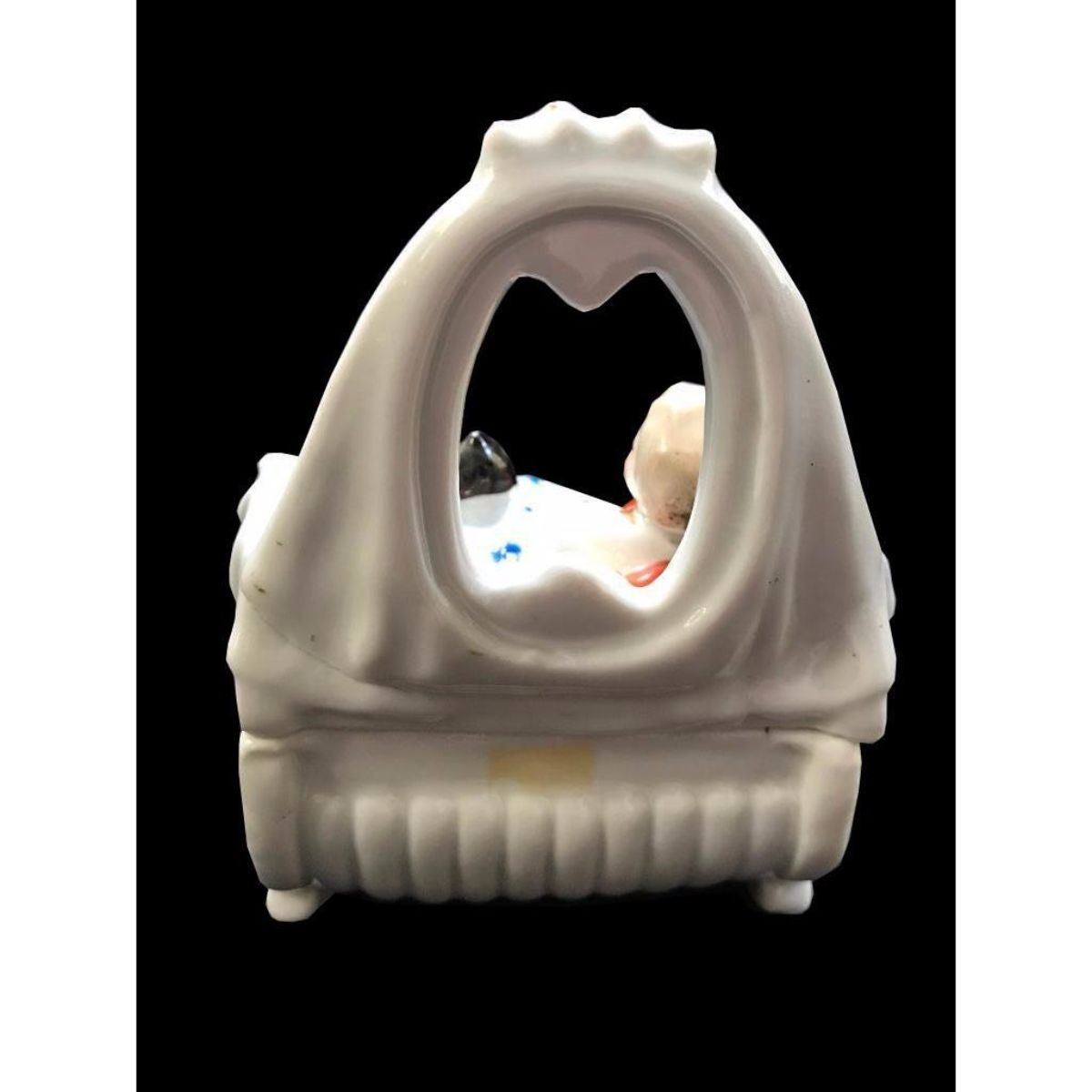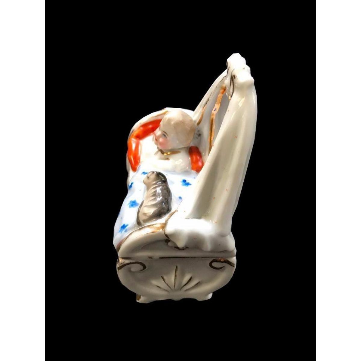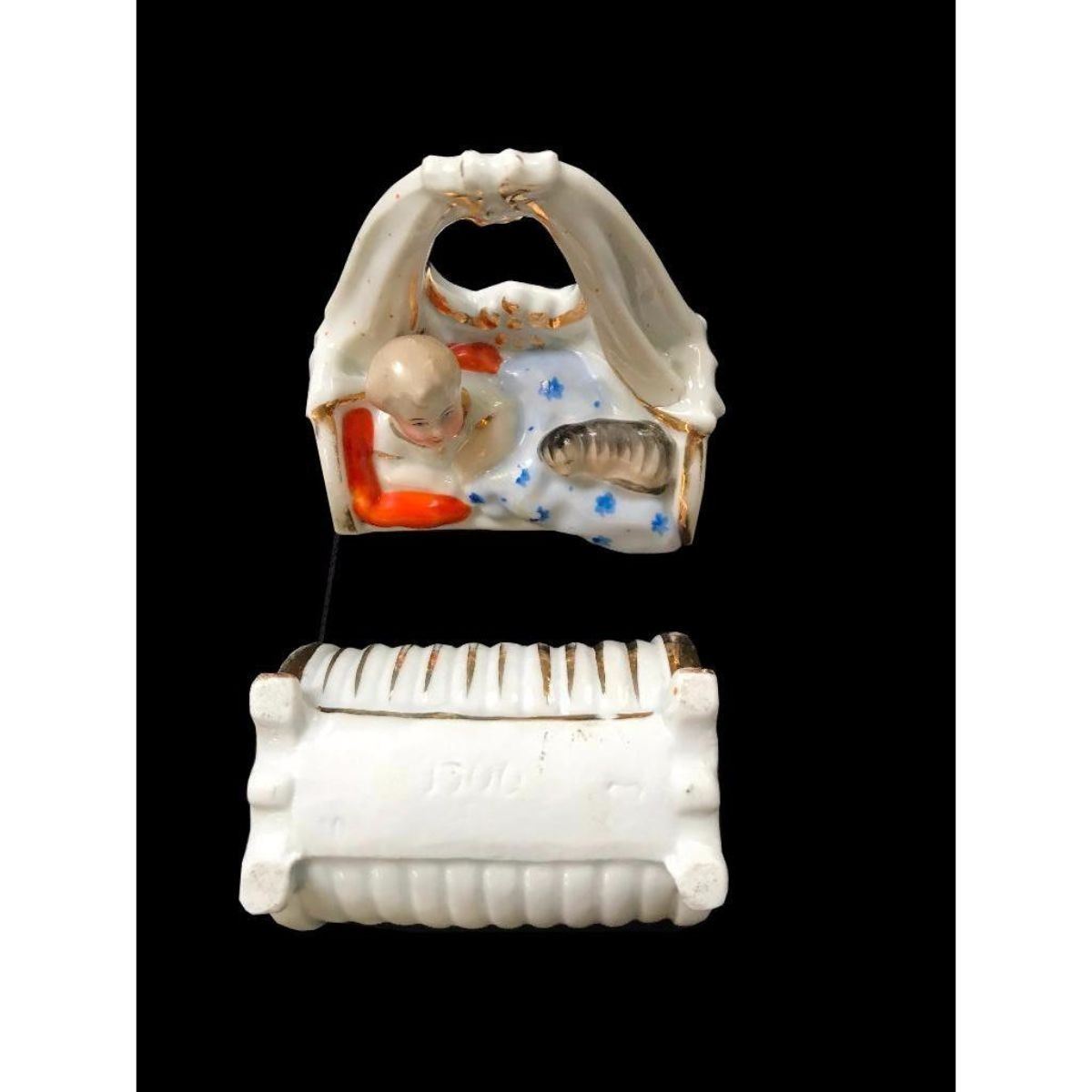 Lovely late 19th Century, Victorian fairing box, German ContaBoehmeporcelain,in the form of a child in bed with a cat. Shield & number stamp on bottom. Vivid colors & gold gilt remains. 4 3/4" H X 3" W X 2" D.