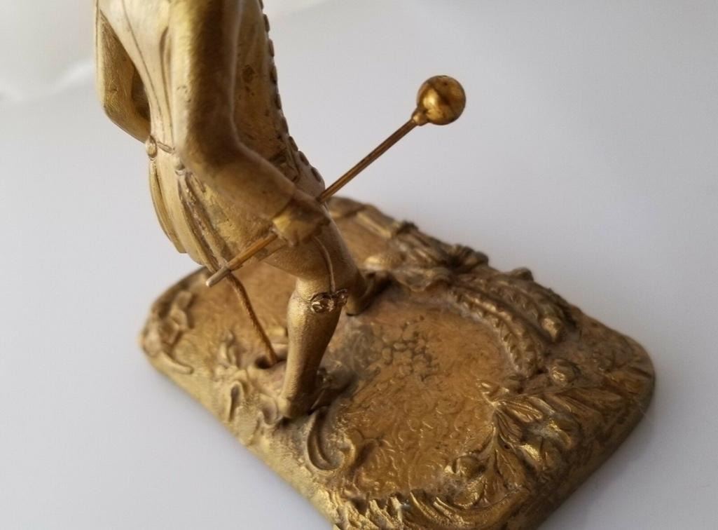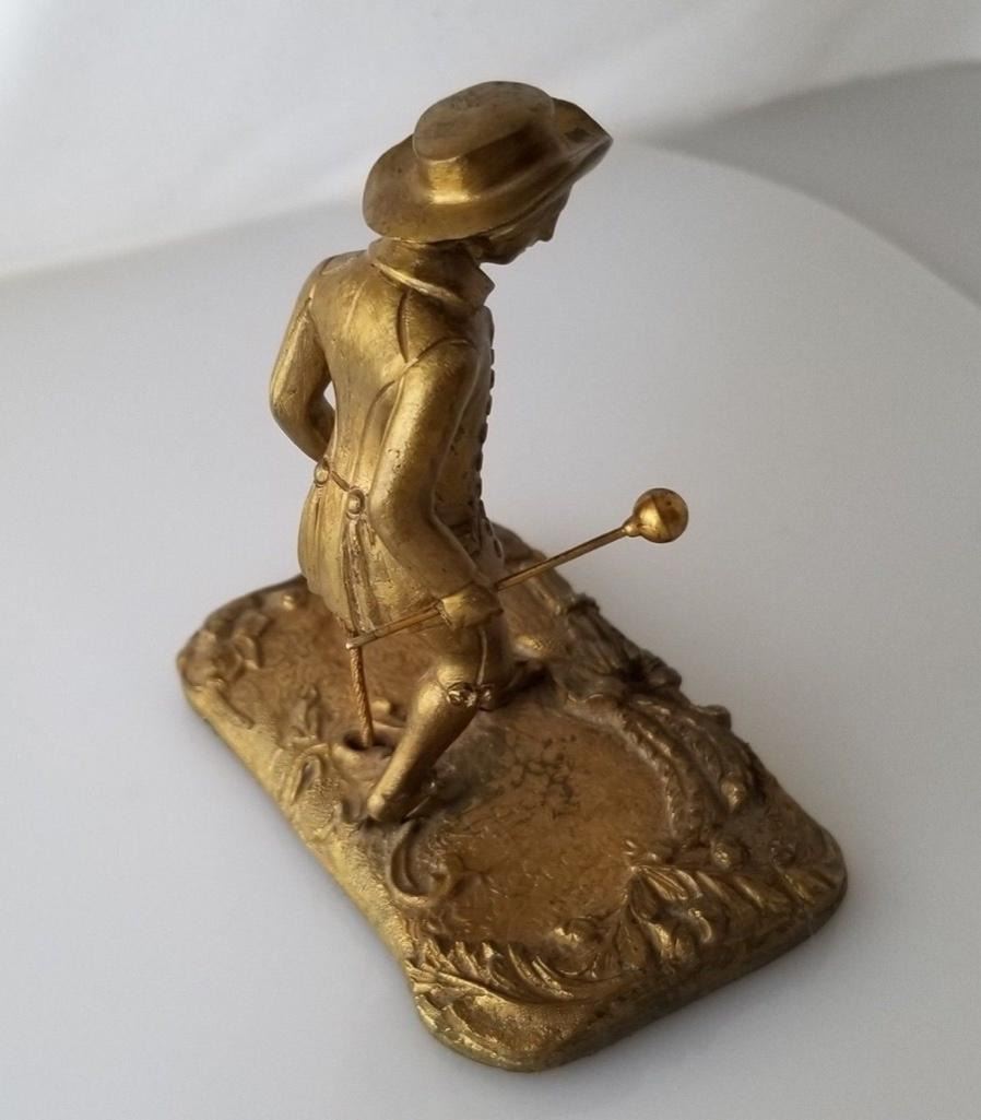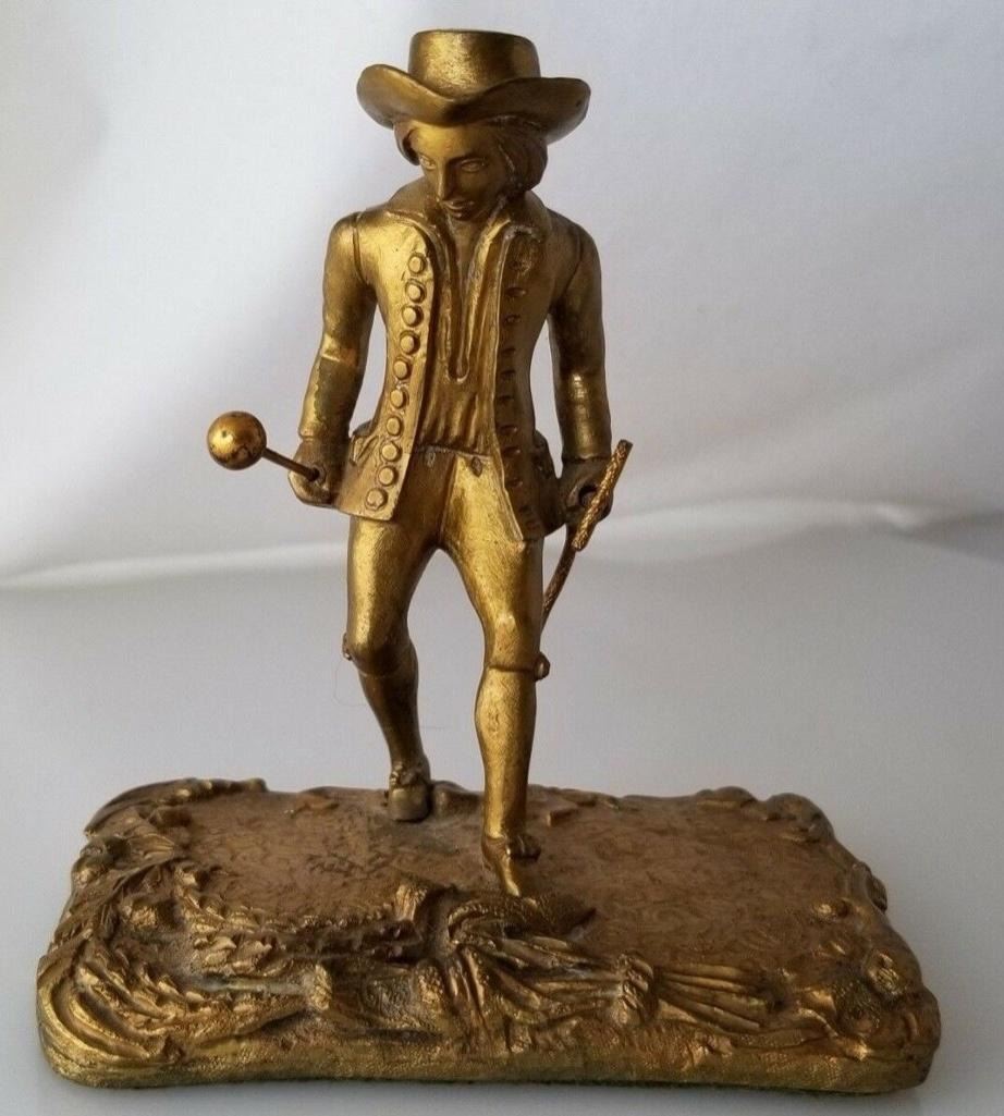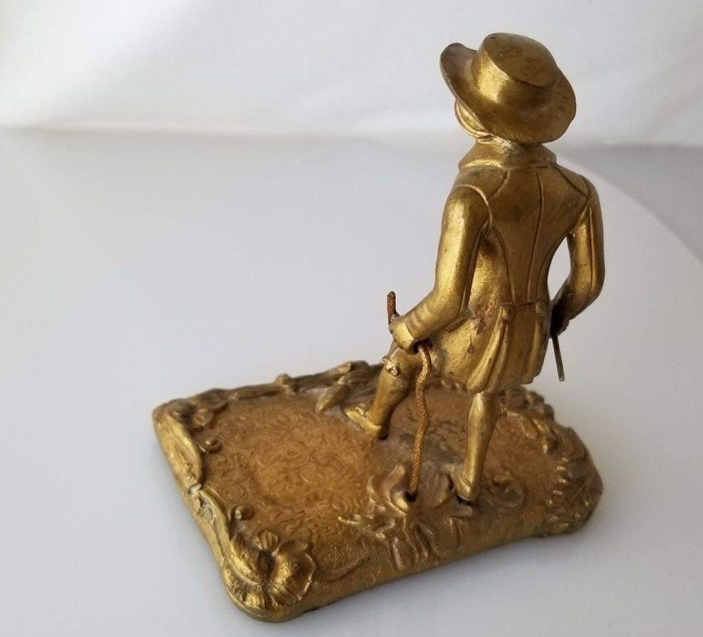c. 1890's Victorian gold gilded figural bronze statue in the form of a squire, country gentleman. Moveable staff & walking stick in each hand, with felted bottom. 4" H X 3 1/2" W X 2 1/4"L.Â