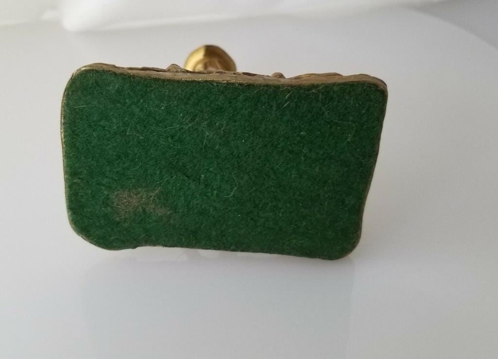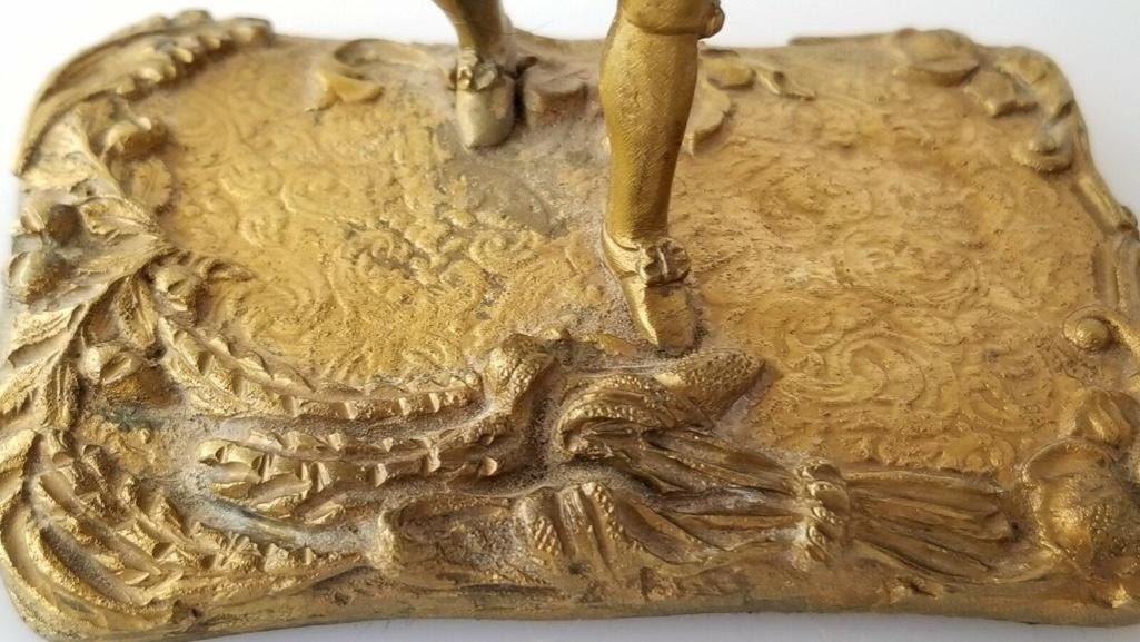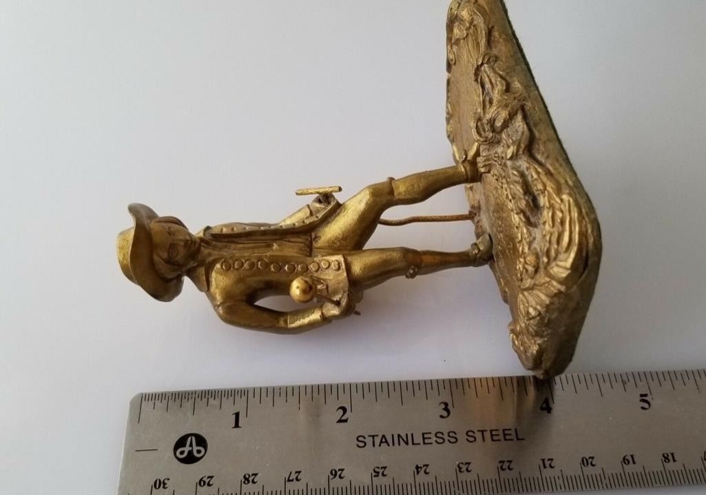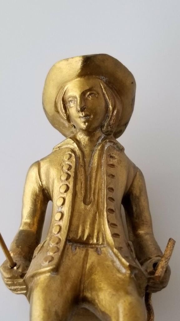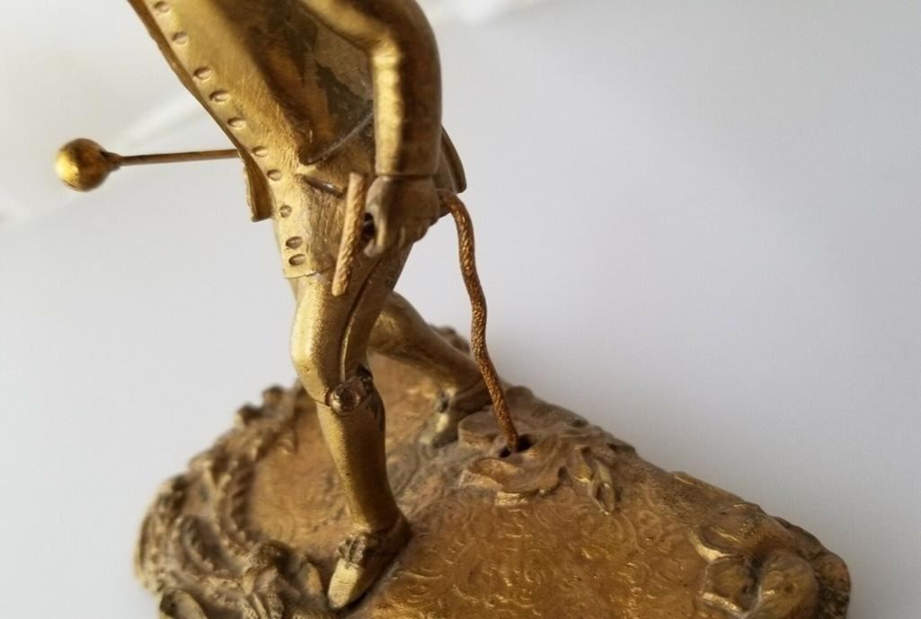 c. 1890's Victorian gold gilded figural bronze statue in the form of a squire, country gentleman. Moveable staff & walking stick in each hand, with felted bottom. 4" H X 3 1/2" W X 2 1/4"L.Â