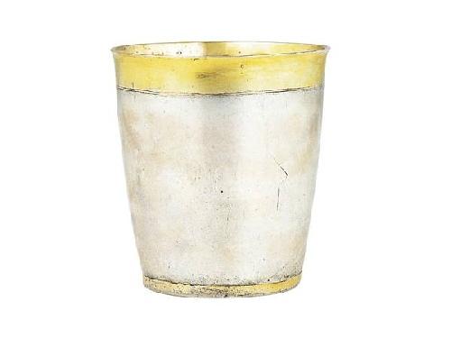 Silver, 152 g, partly with vermeil. Everted rim and ring on the base. Plain surface, gilt rim, engraved decoration under the rim and over the ring. With vermeil inside. Inscription on the bottom: Fejérvári István 1778 . Restored. Marked: 12 lat (24 ounces) fineness, early 18th century, I F maker’s mark in a square. Size: 10 cm