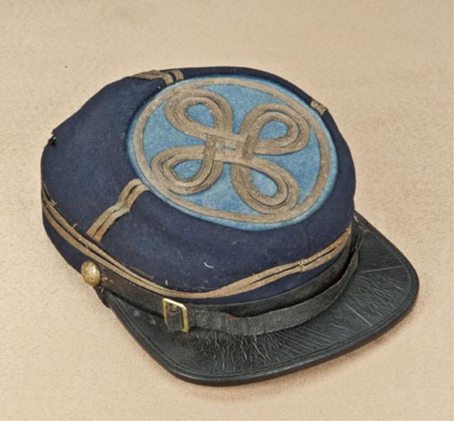 Late Civil War to Indian War officer’s kepi with officer’s quadrafoil, standard buttons. Light blue top. Original liner and chin strap. Slight mothing, 1 tear, some normal aging. Good to very good condition, maker-marked on interior, but not legible (Possibly Waters). Est: $350 - $700
