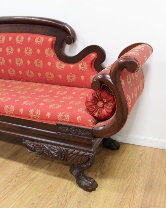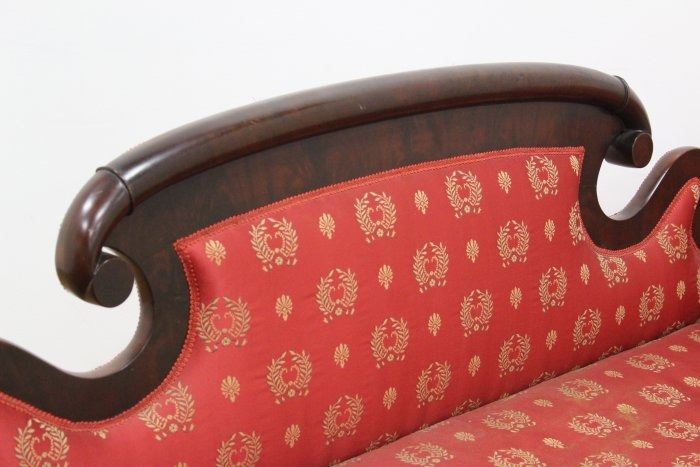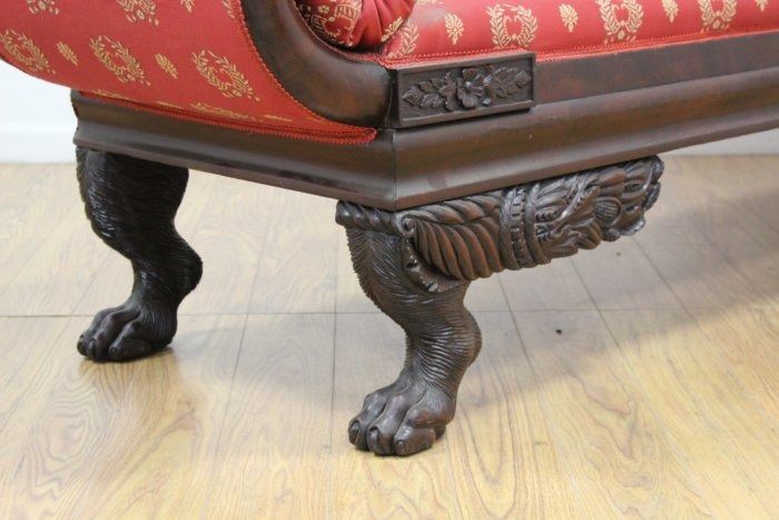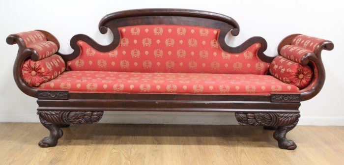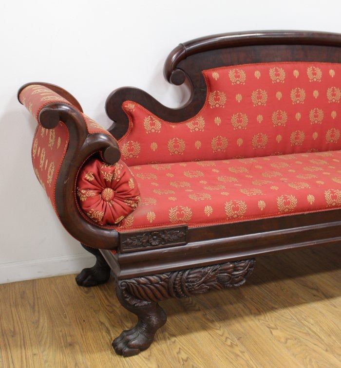 Circa 1830. Upholstered in burgundy silk. Approx. 38" H x 86" W. From the estate of Mark Zulli, antique collector and dealer for 50 years. (6131)
