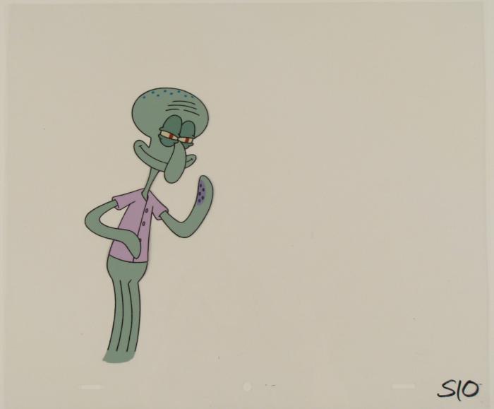 This original animation cel is from the Nickelodeon TV show SpongeBob Squarepants. The story takes place under the deep blue sea in Bikini Bottom, where SpongeBob resides. SpongeBob, who is a yellow, porous sponge, is your typical happy-go-lucky character, as he is always cheerful and enjoys making people laugh. Patrick Star, SpongeBob's neighbor who is a starfish, is your average children's show idiot, as he boasts knowing nothing and is often getting himself into ridiculous situations. Between the homes of these two lies the home of the miserable Squidward, a squid, who is known for being grouchy and playing tricks on SpongeBob and Patrick. Both SpongeBob and Squidward work at the Krusty Krab, a fast food business run by the greedy money-loving Mr. Krabs, a crab, the arch rival of the evil, possibly misunderstood, Plankton. Another neighbor, Sandy Cheeks, an athletic squirrel who normally wears an astronaut's space suit, was introduced in "Tea at the Treedome." She spends most of her time inventing and experimenting. Shown here, it seems that Squidward had a late night last night. Original Production Animated Cel Overall Size of Cel: 10 1/2" x 12 1/2" Excellent ConditionThis is an original hand-painted cel set-up used in the production of an episode of "SpongeBob SquarePants." Each one-of-a-kind set-up represents a slight change in position of the characters. When individually photographed and projected in rapid succession, the images appear to move.