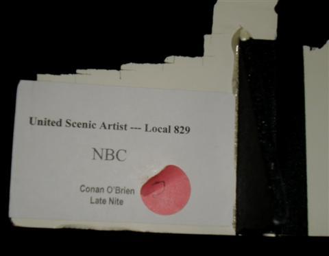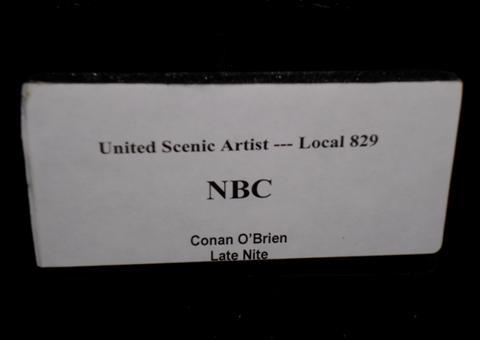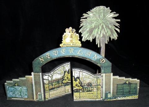 Late Night with Conan O'Brien - A miniature of Michael Jackson's Neverland Ranch entrance and a palm tree. Made by United Scenic Artist for NBC and used for a sketch. Label on back of each item. Made on foam core board and the gates open. Obtained at the famous Broadway Cares Flea Market held annually in NYC. Gate: 14" x 8". Palm tree: 15"