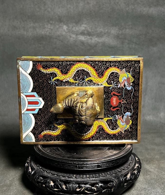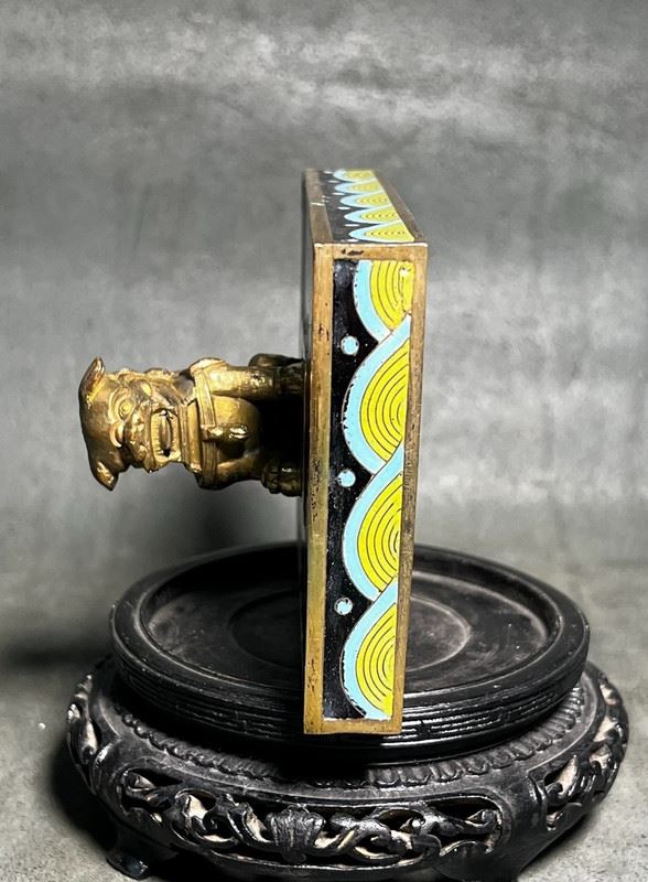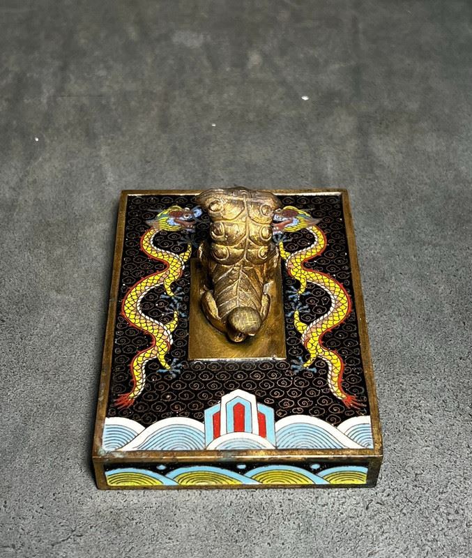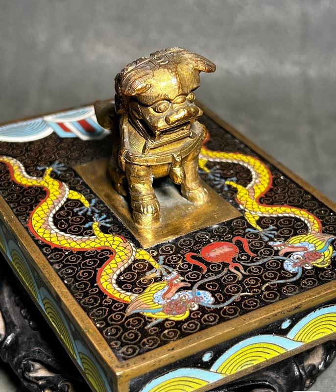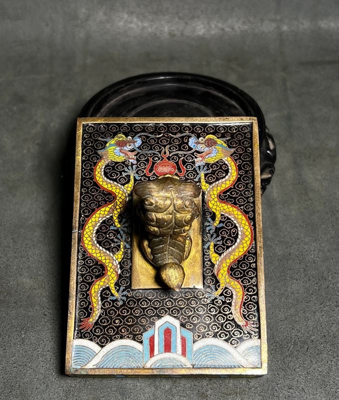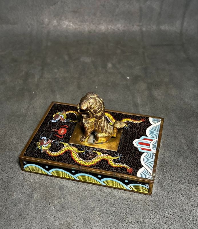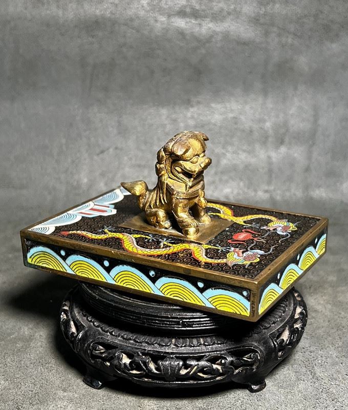 Dating from the Late Qing to Republic period, this cloisonné paperweight is crafted with a copper body and gilded details. The black enamel ground is decorated with two lively dragons pursuing a flaming pearl, symbolizing imperial power and auspiciousness, while the lower section features multicolored wave-and-mountain designs representing stability. At the center rises a finely cast gilt lion finial, embodying strength and protection. With its bold imagery and refined craftsmanship, the piece served as both a functional scholar’s object and a collectible ornament.