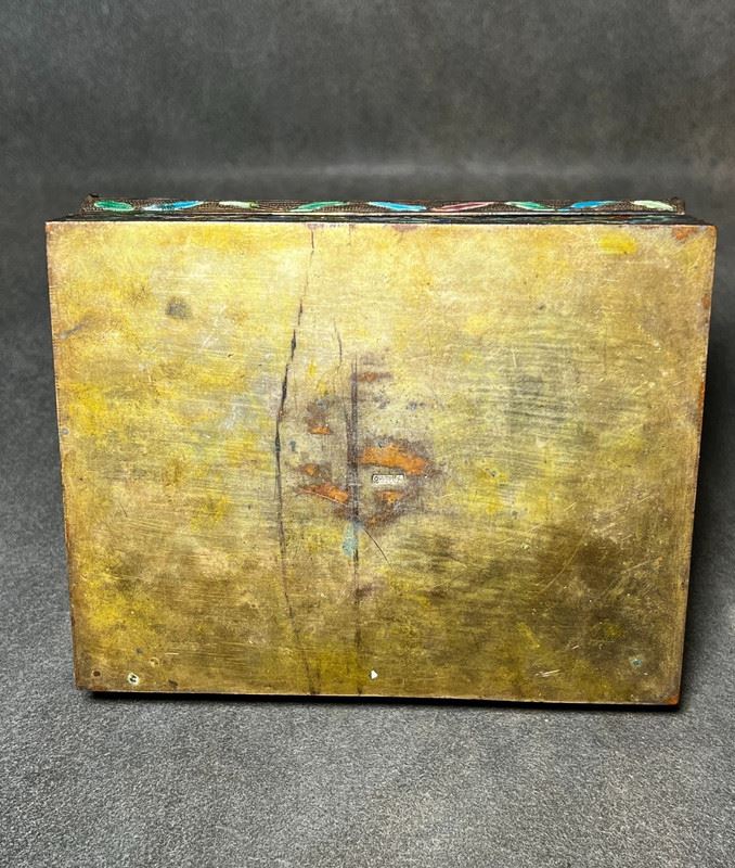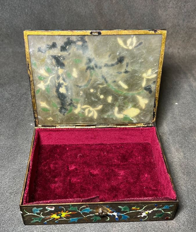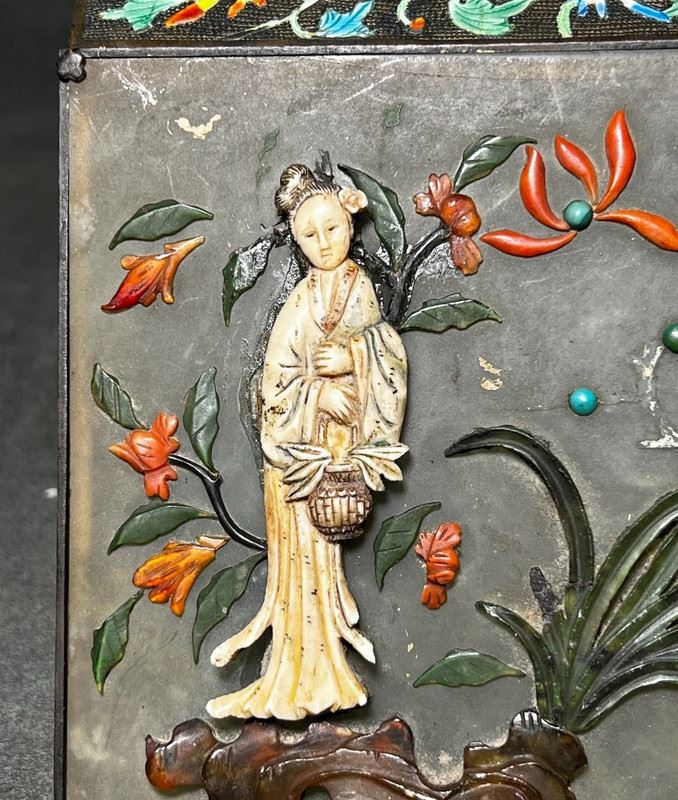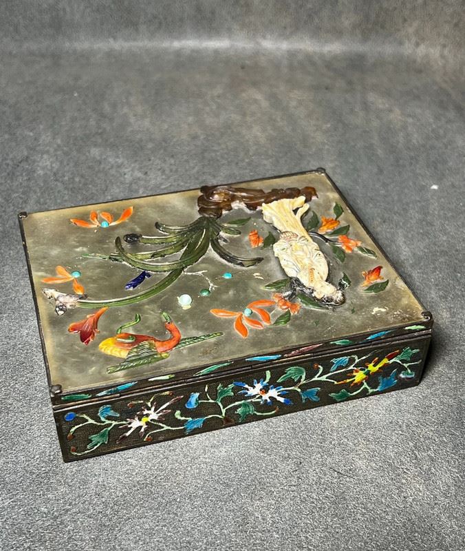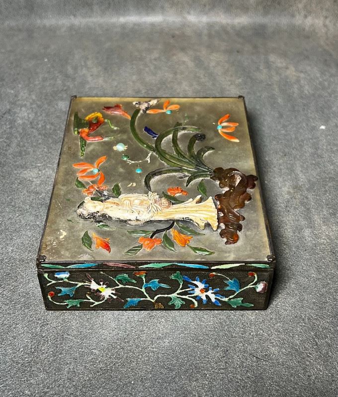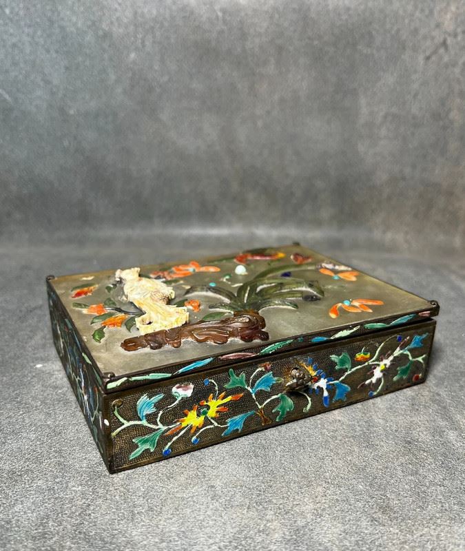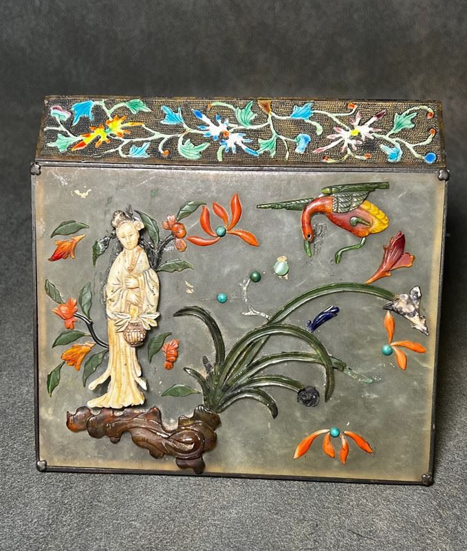 This jewelry box, from the Late Qing to Republic period, is crafted with a copper body and adorned with the hundred treasures inlay technique. The lid features a relief of a lady with floral motifs, enriched with materials such as jade, coral, and turquoise, creating a vivid and textured composition. The sides are decorated with cloisonné floral patterns, reflecting exquisite craftsmanship. Combining practicality with artistry, this jewelry box is a fine example of traditional decorative art and a valuable collectible.