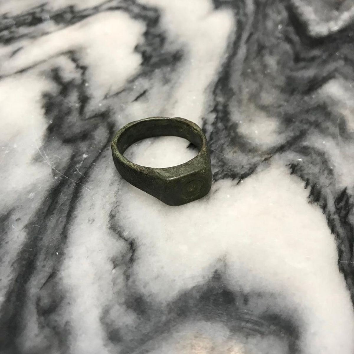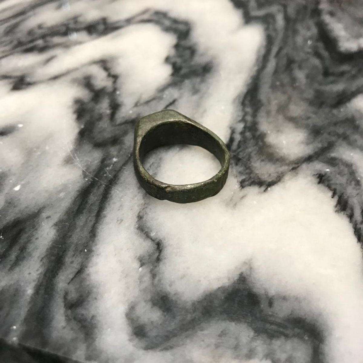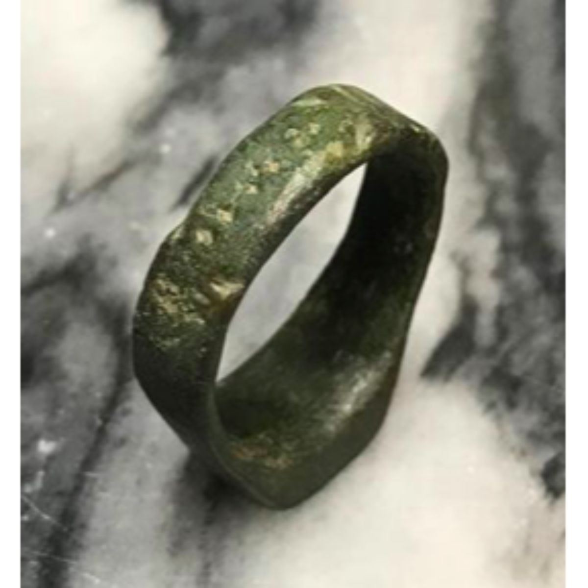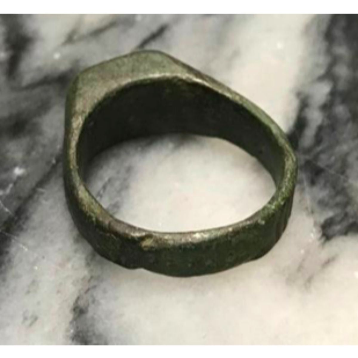 Late Roman Period bronze ring, artifact, with squared bezel with an indentation for stone & vertical grooves along the band. Missing stone, possibly an intaglio glass stone? Wearable size 7.5. * slight bend to band.