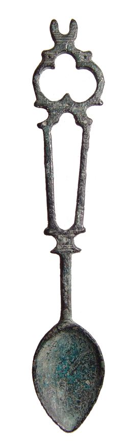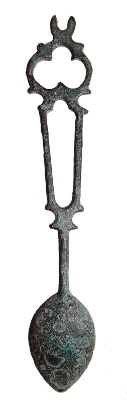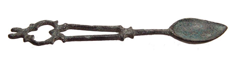 A nice late Roman-Byzantine bronze spoon, c. 5th - 8th Century AD, with attractive openwork handle, the bowl pear-shaped with low profile. L: 5 in (12.3cm). Nice green-brown patina. Ex Rhode Island private collection.