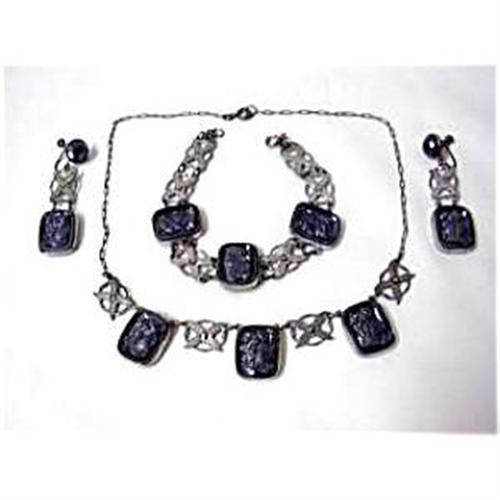 Late victorian parure with necklace, bracelet and earrings, consisting of black( which I believe is jet) intaglio cameo links, rectangular in shape, and cameos of a woman's head, she has long flowing hair and sharp Roman features. I am not that familiar with jet so I can't say for certain this is jet but it is very light weight and the open back is dull and grainy. Each intaglio is set in silver and attached to an open pierced link of four raised leaves, sitting in an oval open pierced design, with one marcasite in the center of the four leaves. Both the necklace and the bracelet have three intaglio links and four open pierced links. Earrings are screw back dangle with same design and a faceted cabochon, bezel set at the top. A paper clip chain attaches on each side to the center design on the necklace. Set is silver but not marked. An outstanding parure that is breath taking in design and composition. Necklace measures 16 in.'s long. earrings are slightly over 2 in.'s long, bracelet measures 8 1/4 in.'s long. All intaglio cameos are 3/4 in. long and 1/2 in. wide. Condition is overall excellent with a marcasite missing on each end of the bracelet links, which doesn't show. it needs a little polishing. One of a kind finds!!