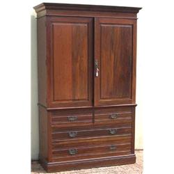 Late Victorian Maple & Co. walnut linen press with moulded cornice above panelled doors enclosing 4 slides, the base with 2 short & 2 long graduated drawers, on plinth base, 52ins. wide (overall) (see illustration). Est.£400/600