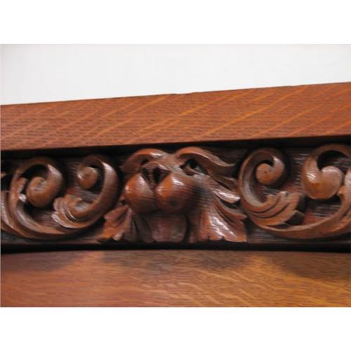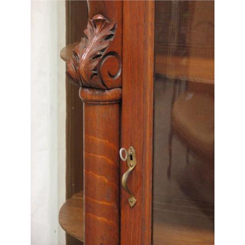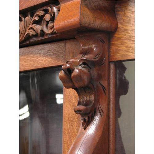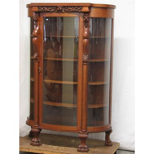 Late Victorian Classical Revival Oak Half-Round Bowfront China Cabinet, ca. 1890-1920. features an ornately carved lion mask and ancathus crest , with one center door between carved lion mask above round pilasters resting on four lion paw feet, brass handle escutcheon, key included. 66 1/4"H x 44 1/2"W x 18"D. Condition: expertly refinished, no damage noted.