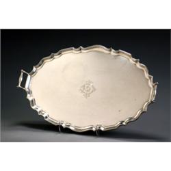 The oval tray enclosing an engraved monogram within a shaped molded rim flanked by two scroll handles. Marked on base.