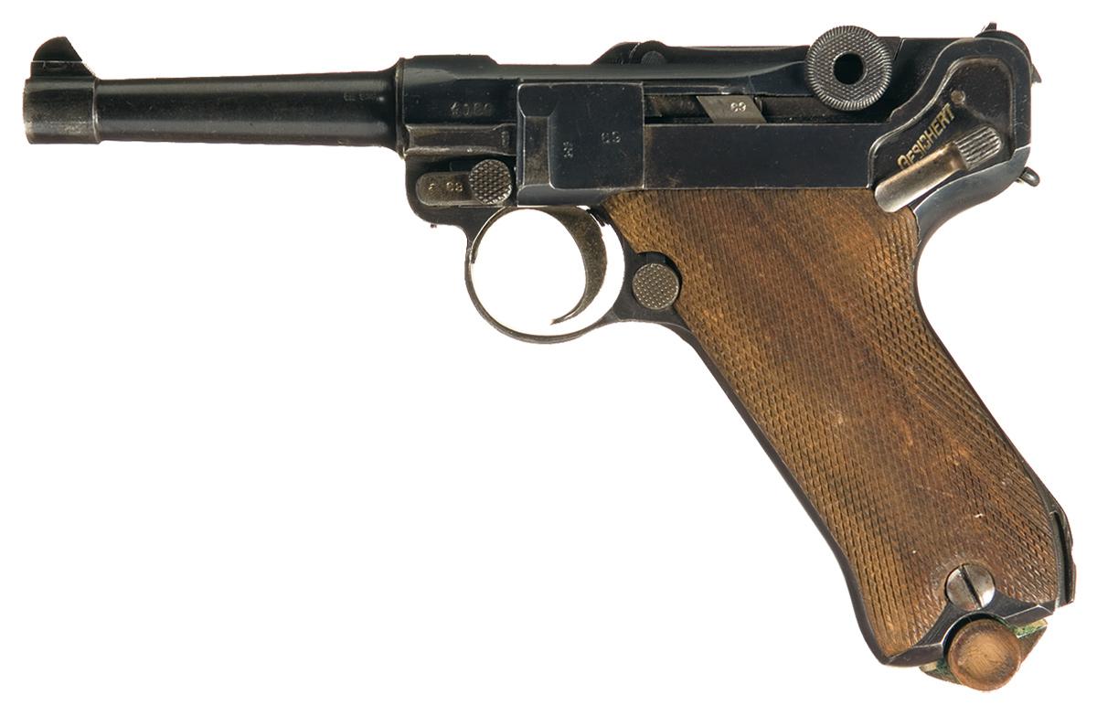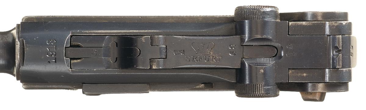 This is an excellent example of a 1918 dated Erfurt military luger that is complete with a matching wood base magazine and brown 1917 dated leather holster and spare non-matching magazine. This was the main side arm used by the German Army in WWI and WWII. It was manufactured by the Imperial German Arsenal at Erfurt and has a chamber date of "1918" with the toggle marked with the "Crown / ERFURT" logo. The right side of the barrel extension is stamped with three crown over German Script letter proofs next to the Imperial Eagle proof, with a small Crown over "RC" proof and the left side only the serial number. The top of the barrel is marked with a single Imperial Eagle proof on right side, with a crown over "RC" and crown over script letter proof on the left side. The underside of the barrel has the serial number above the bore diameter markings. The thumb safety and the extractor are correctly marked "GESICHERT" and "GELADEN" respectively. It has the standard front and rear sight with the lanyard loop and stock lug. The trigger, magazine release, thumb safety and take down lever are straw colored. It has the walnut checkered grips and a matching wood base, nickel plated magazine marked "4069 m" along with the appropriate proof and a "+". The various parts of the pistol have the correct Crown over script letter, or crown over "RC" proof or both, which is normal for all Erfurt manufactured Lugers. Complete with an original WWI brown leather holster that is stamped on the inside of the flap, "J.M. ECKERT/1917/ULM a/D. along with the name of PFC. Edward Chaffee pencil marked in several places. The spare magazine is also an original WWI nickel plated wood base magazine that is marked with only a "22" on the base. It has the all rust blued metal parts with the straw colored small parts.