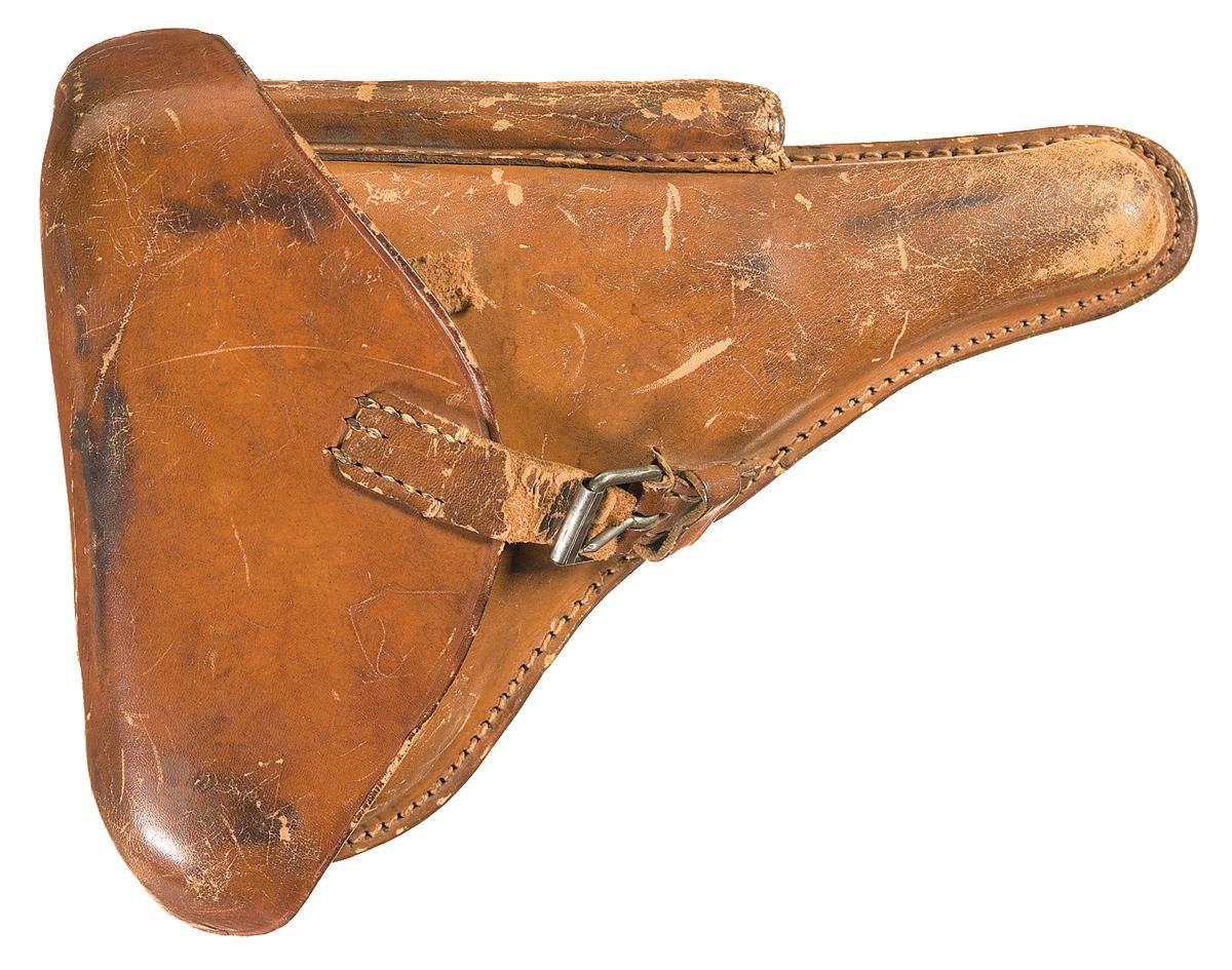 Condition: Very fine with 90% plus of the original finish overall with thinning and wear on the edges and high spots with slightly more wear on the left front sight base, the front edges of the frame rails, and the side plate hump. It retains 75% of the original straw color on the small parts. The grips are in excellent condition with nice checkering overall with some light freshening of the checkering on both sides. The holster is in excellent condition with slight scuffing of the leather on the magazine pouch and the toe with excellent tight stitching, very nice color overall and a clear and sharp marker's stamp. As noted the pistol has all matching numbers to include the one magazine. Note: The very top front edge of the breech bolt has been chipped on each side of the broken extractor which moves freely up and down.
