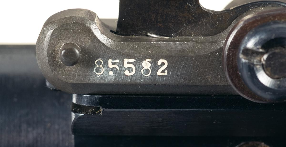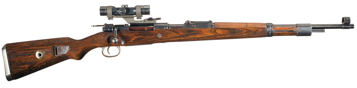 Condition: Excellent overall with 98% of the original blue finish on the rifle, with the trigger guard and scope mount having 99% of their phosphate/parkerized type of finish. The scope has 99% of it original high polish blued finish and has clear sharp optics. The stock and hand guard are both in very good plus condition with a nice matching medium brown unsanded finish, with a professionally repaired duffle bag cut under the rear barrel band. As noted the scope mount is matching to the rifle but the complete bolt assembly is mismatched. Regardless this is still an exceptionally rare and very seldom seen late war Swept back variant sniper rifle.