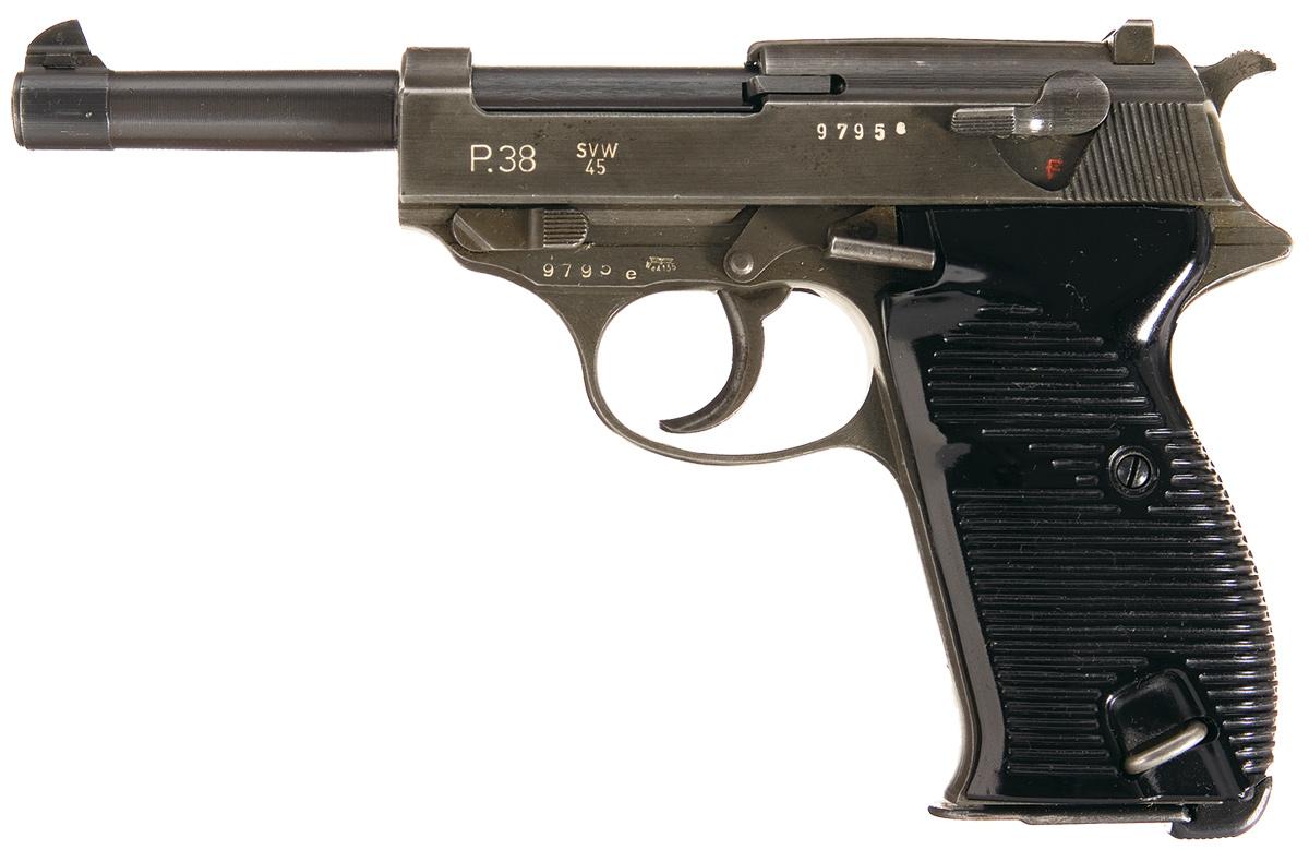 This is an excellent example of a late WWII Nazi Mauser P38 pistol. This P-38 pistol carries the "svw" code markings for the Mauser factory. The right side of the slide has the single "Eagle" firing proof with the double" Eagle WaA135 Waffenamt" proof and the left side of the slide is marked "P.38/svw/45 (stacked)/9795e". The left side of the frame and barrel lug each carry a single Eagle WaA135 Waffenampt for the Mauser factory. The pistol has the late war dual tone finish with the phosphate finish on the major metal parts except for the barrel which is blued. It is fitted with the late black plastic grips with ribs on the sides and is complete with a single wartime magazine that is marked P-38v on the side.