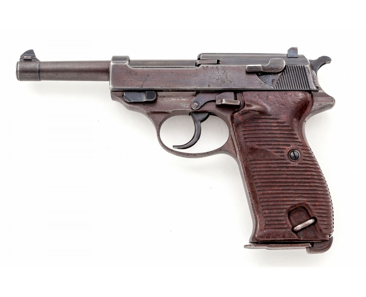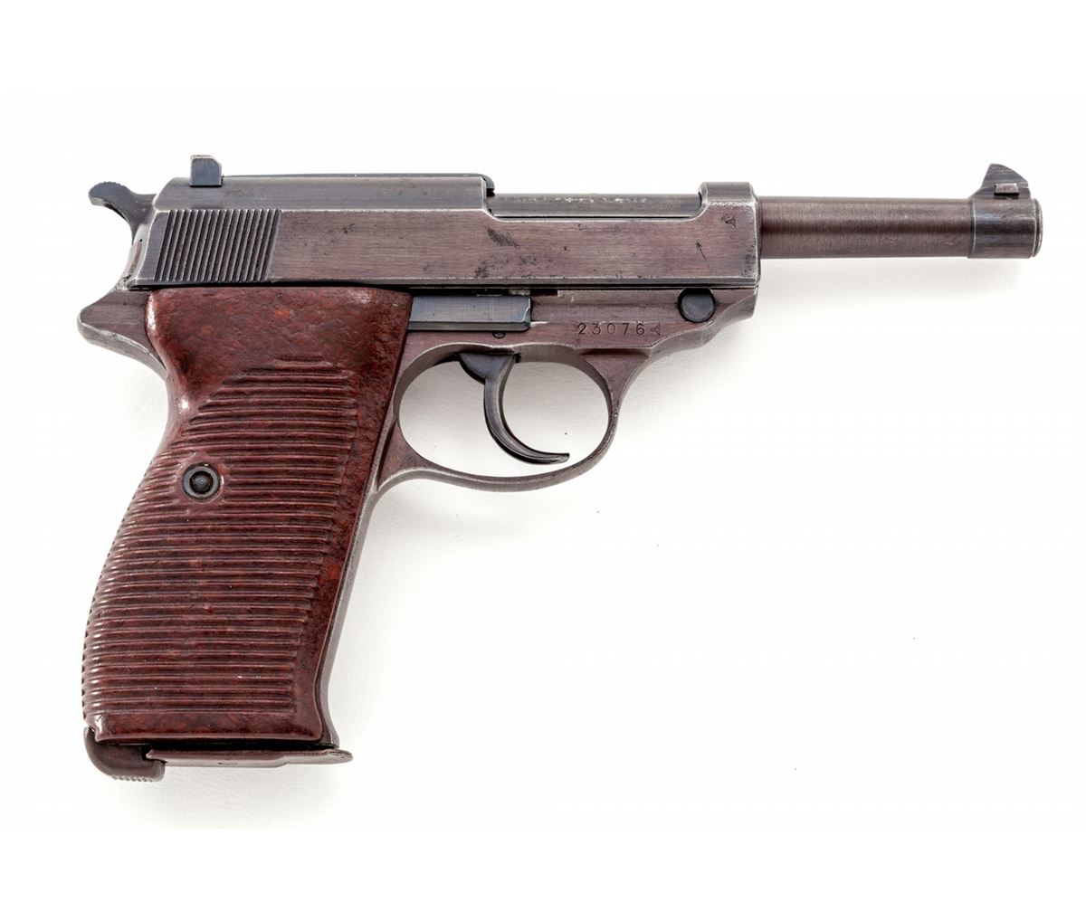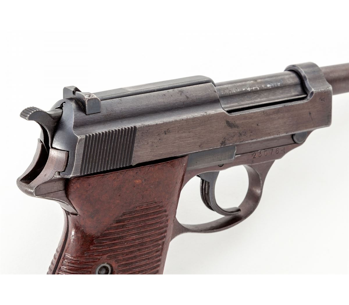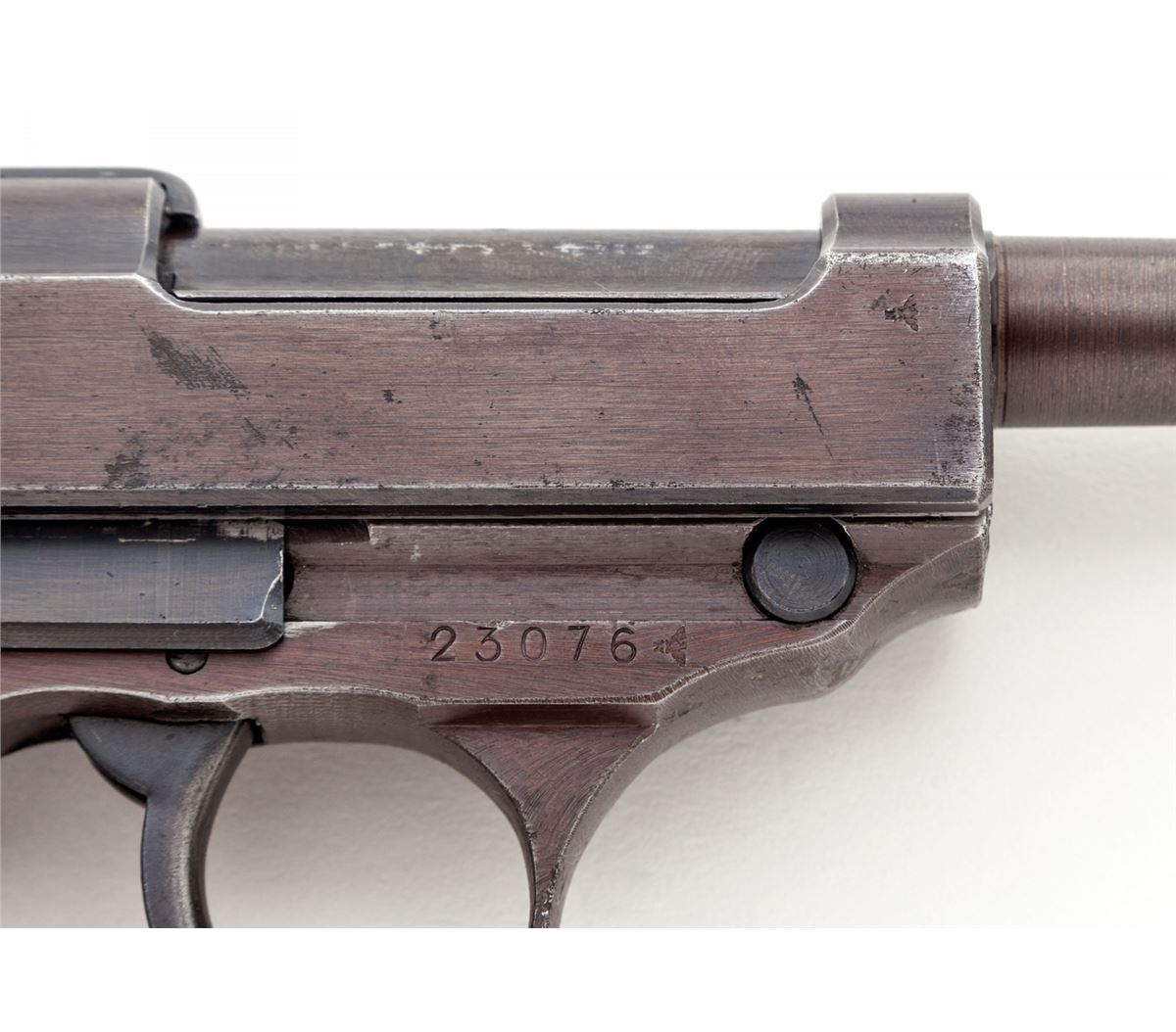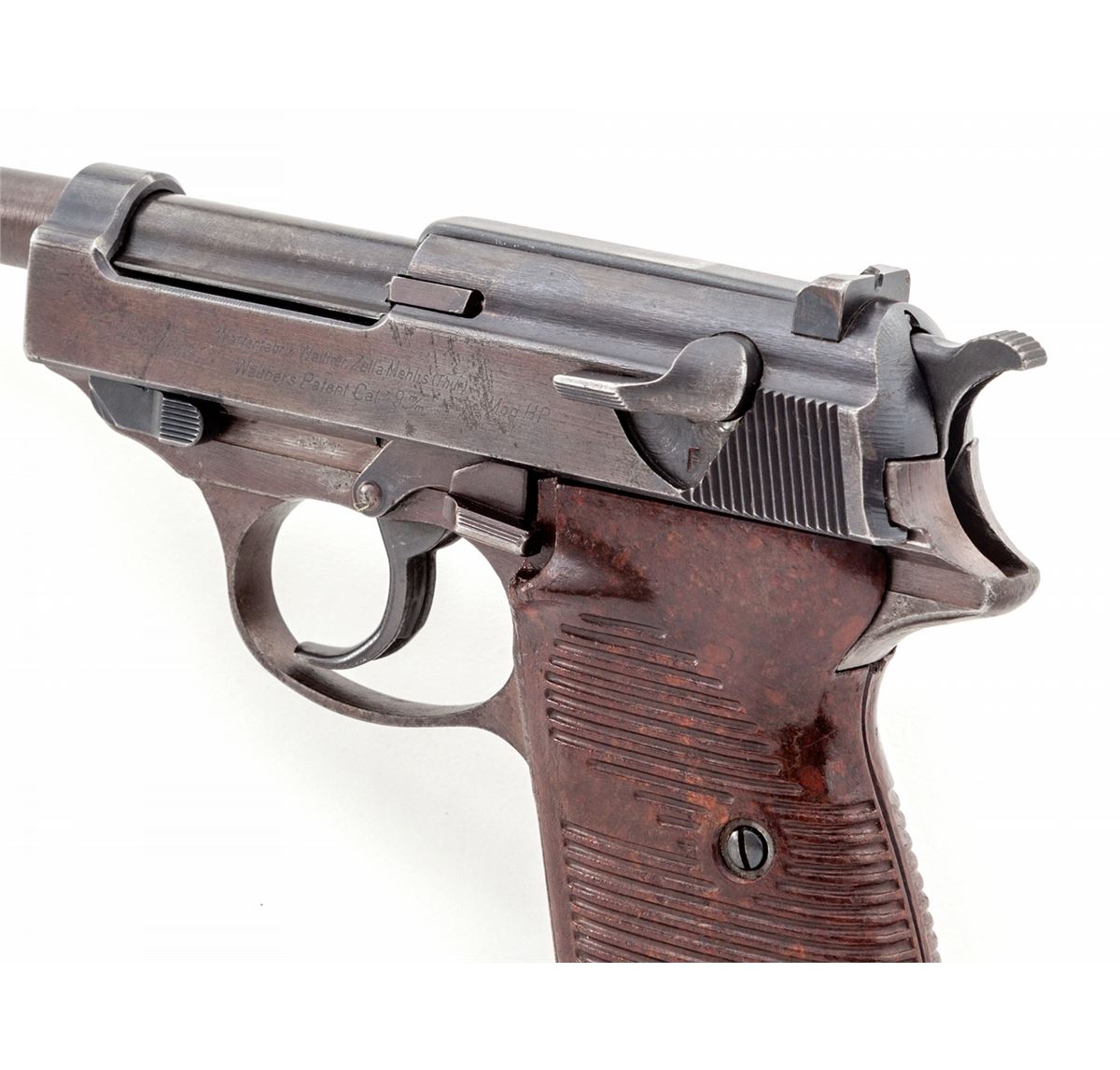 Late-War Commercial Walther Model HP Semi-Automatic Pistol, #23076, 9mm, 4-7/8'' barrel, blue and plum finish, brown grooved phenolic resin grips, with ''(eagle)/N'' proofmarks to slide, frame and barrel assembly. Barrel with matching numbers, locking block marked ''076'' in larger format block script. Condition is very good to near fine with light overall general thinning to finish. Light pitting through slide address. Grips definitely show signs of being a late-war variant. Action is crisp, bore is fine. Original red and white paint remain in the safety area. These late-war commercial pistols were used by different non-military agencies, such as police, customs and railway. These later commercial HPs in no way mimic the pre-war finishes. Est.: $1,200-$1,800. (C&R/PPT)