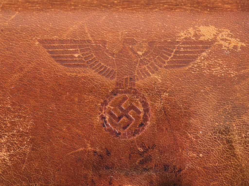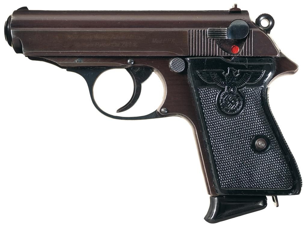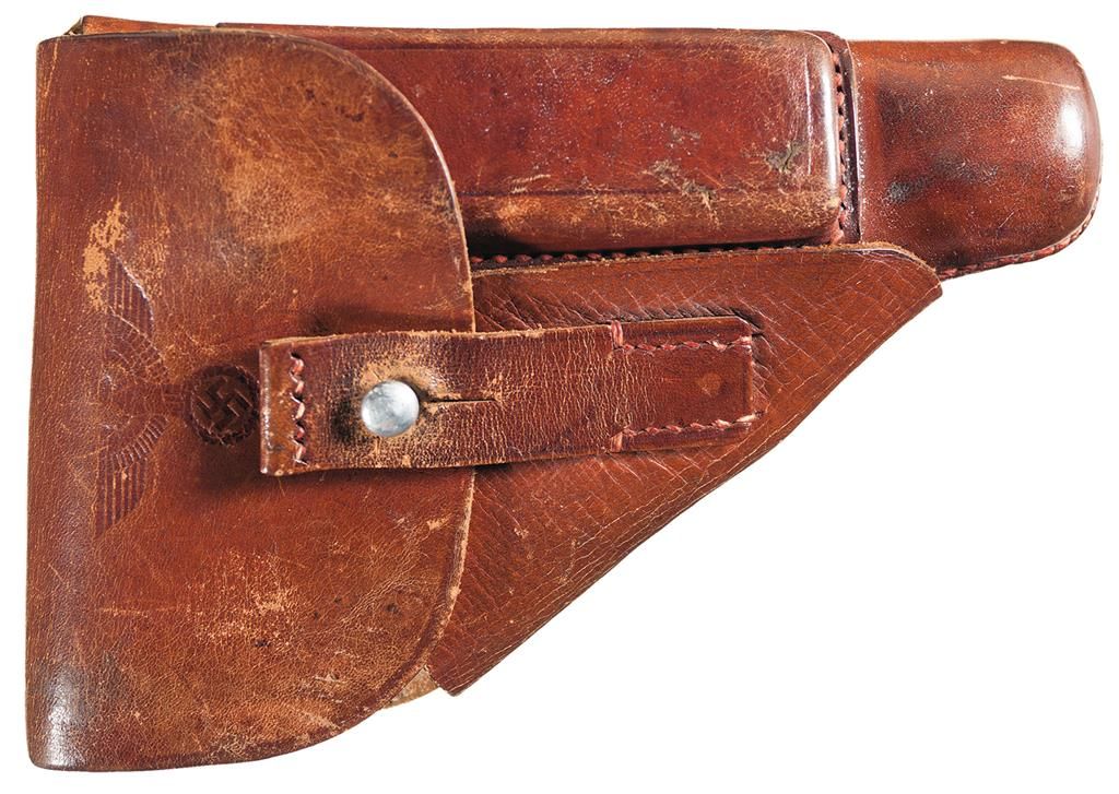 Known officially as the "Honor Weapon of the Political Leaders", the PPK pistols with these special grips were presented to NSDAP officials for meritorious party service by the Fuhrer. The pistol has a plum-tinted blue finish, showing a deeper blue on the trigger guard. The reproduction black plastic one piece wrap around grips are checkered and have the NSDAP eagle holding a wreath encircled swastika insignia cast on the top of the both sides. Fixed sights, with the standard model and address markings on the left side of the slide, "eagle/N" proofmarks on the right side of the slide, chamber and muzzle and matching numbers on the right side of the frame and slide. Equipped with a chamber indicator pin, 60 degree safety, a lanyard staple on the butt and a blue magazine. Comes with a brown leather two flap holster with the NSDAP eagle/swastika on the upper flap, unreadable purple stamp on the inside of the flap and stamped "S.R.G.M." on top of the lower flap.