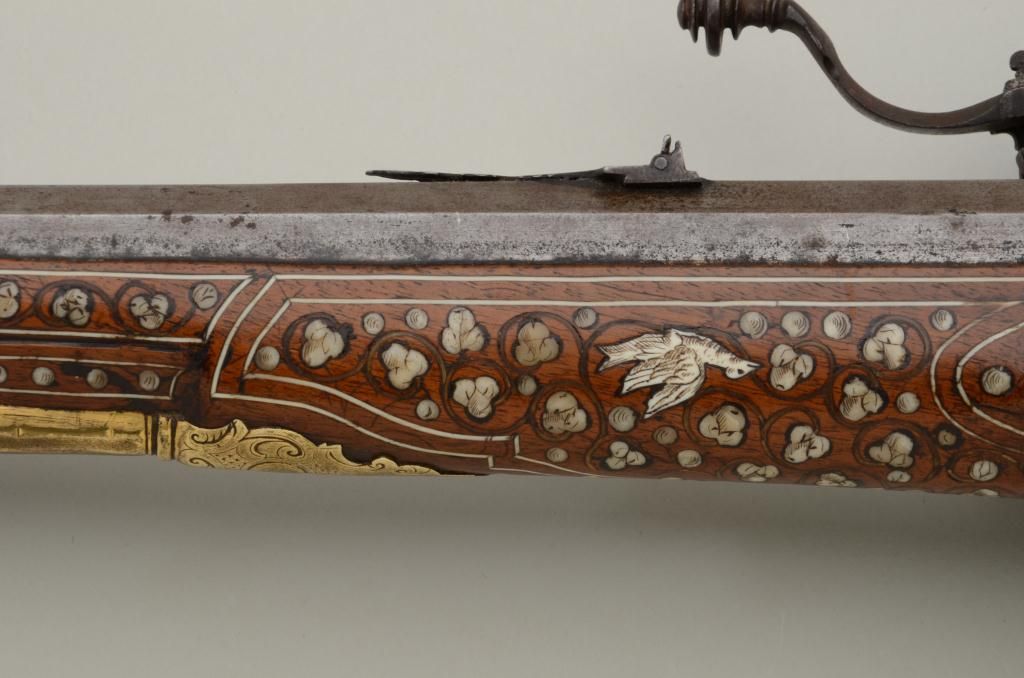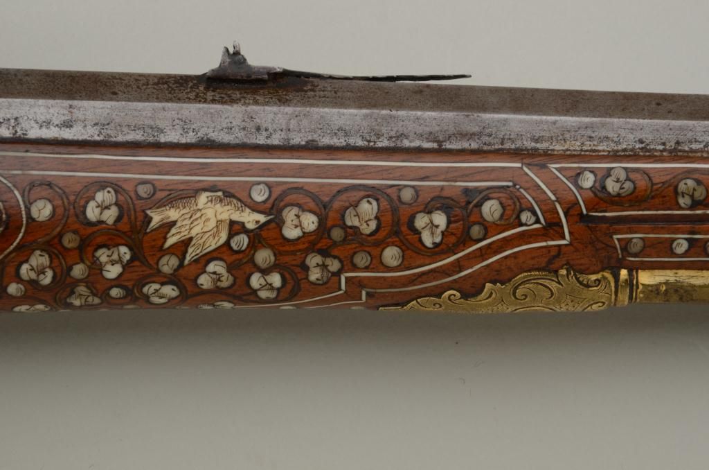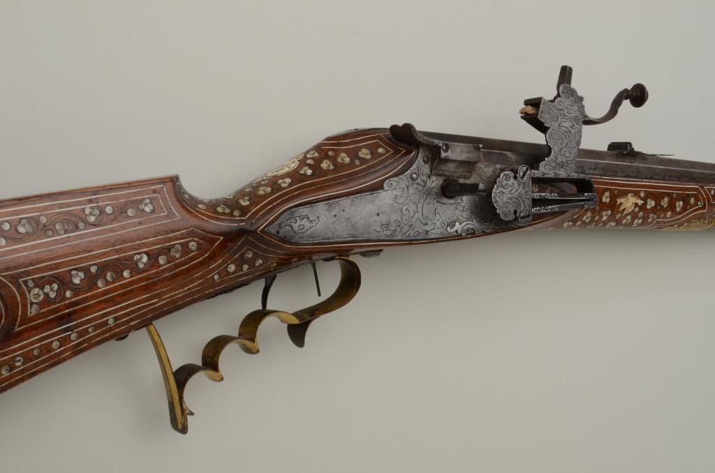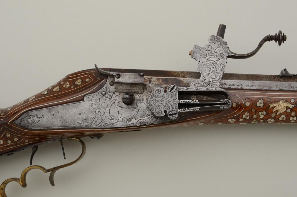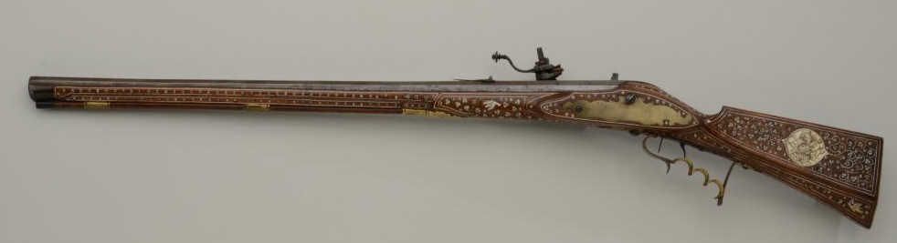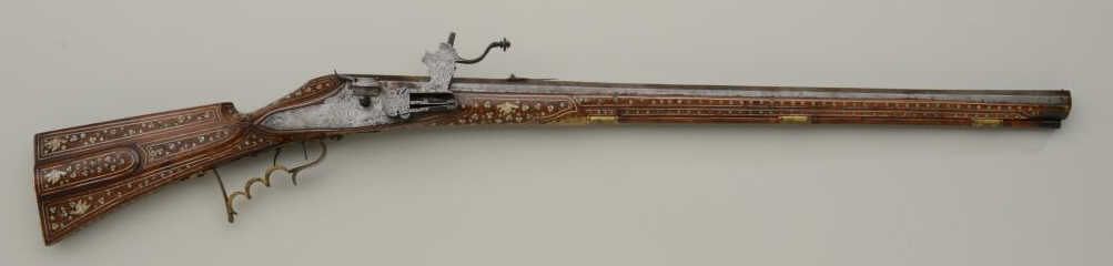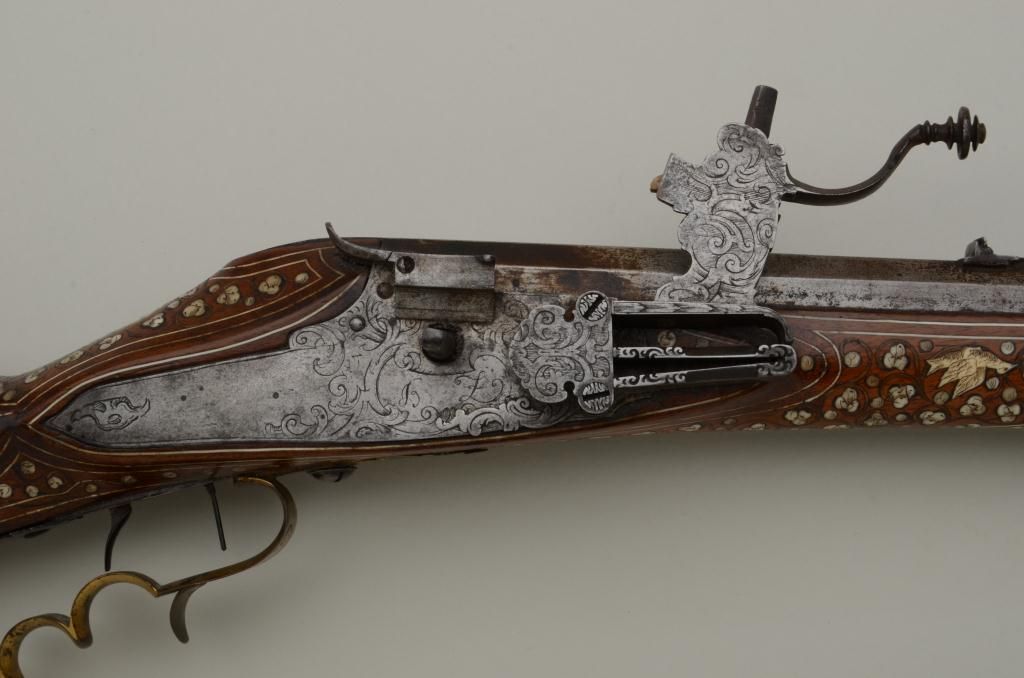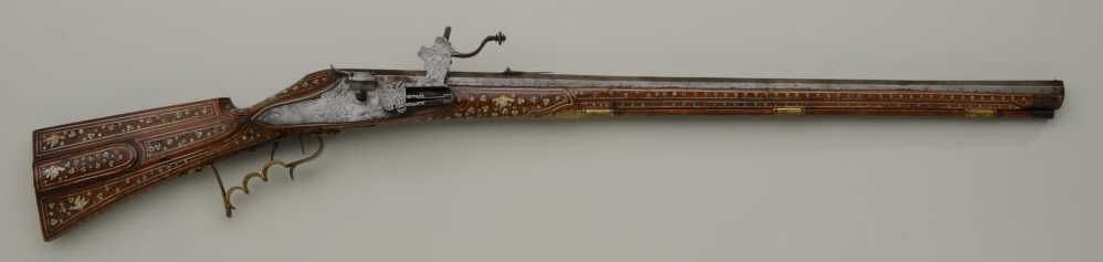 Late Wheelock hunting rifle signed in fancy script initials on lock possibly for one of Zellner family. The rifle measures 45 ½” overall with 31” barrel of approximately .58 caliber. The stock is nicely inlaid in the19th century probably by Spitzer and the brass mounts show traces of original gold gilt and are nicely engraved. There is a beautiful stand of lock arms engraved upon a large plaque inlaid on the right side ofstock. The inlays are 98% plus intact and we could find none missing. The stock is in very good condition with a light coating of spray clear lacquer and the metal surfaces show a light gray to brown patina with somescattered minor light to moderate pitting. The lock plate and hammer are lightly engraved and are in good condition. The lock shows an enclosed wheel of the late era. There is a number on the barrel which appears to be 91 or 97 and that may correspond with the date of Mfg. about 1691-1697. There is a wing screw for removing the lock plate on the left side plate. The interior of the lock is complete and the gun is at least very good