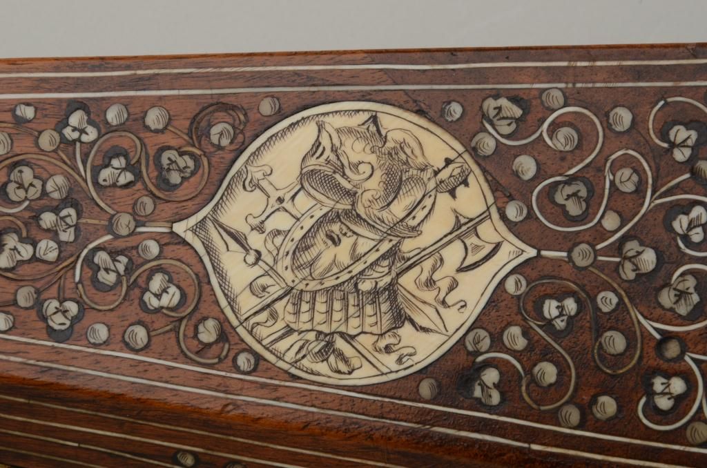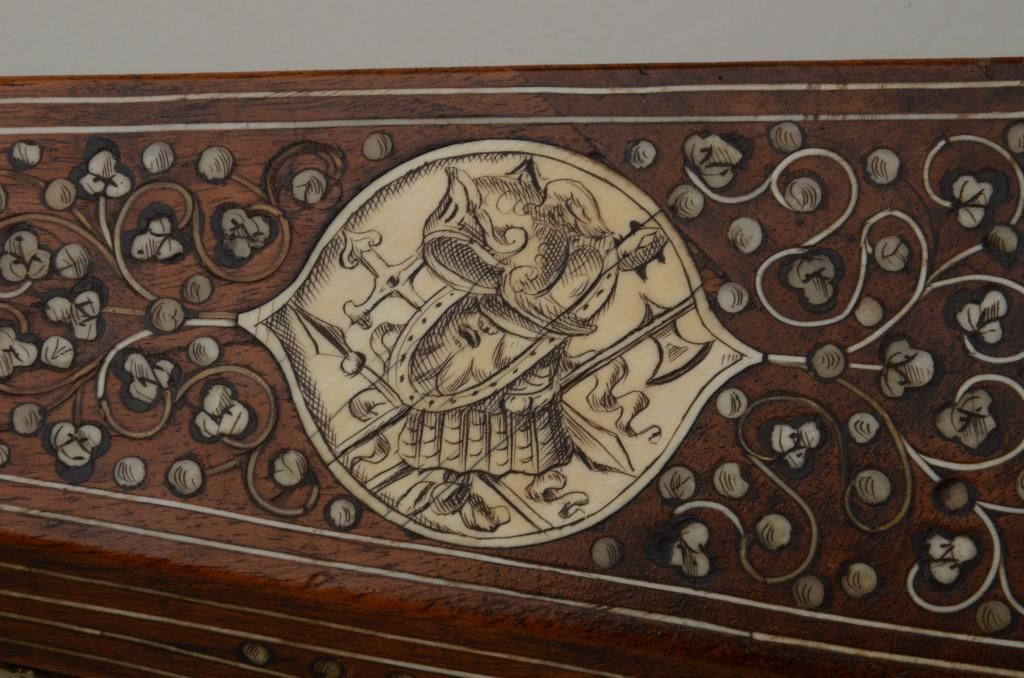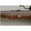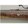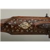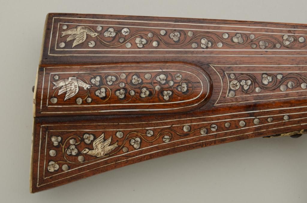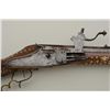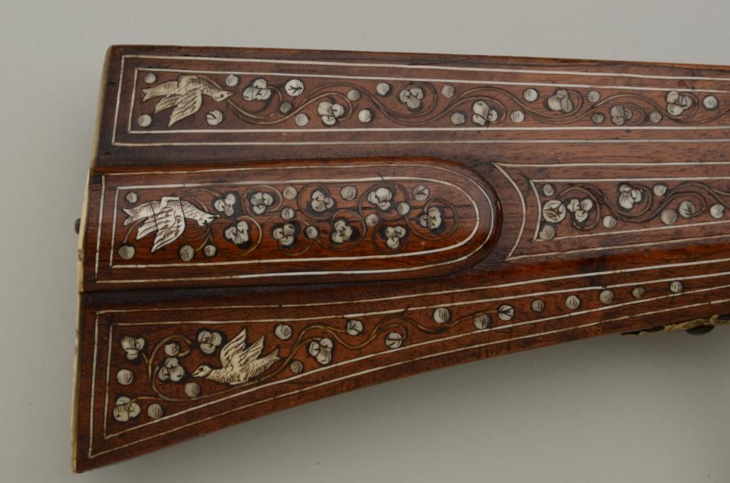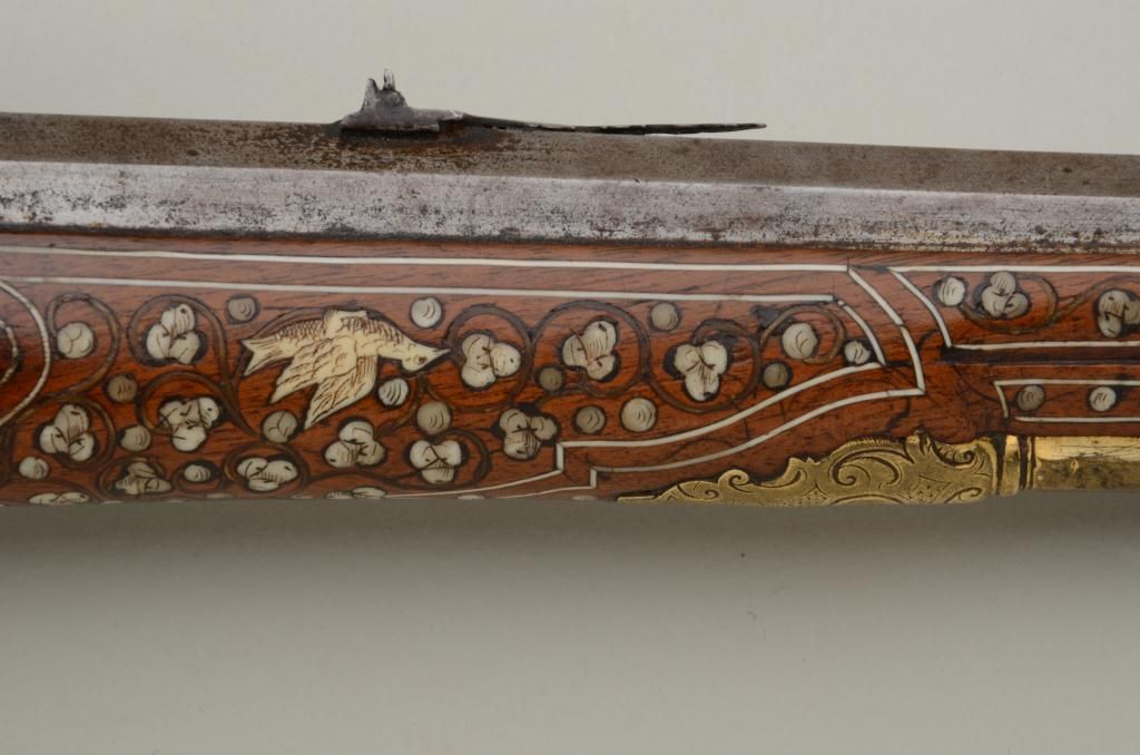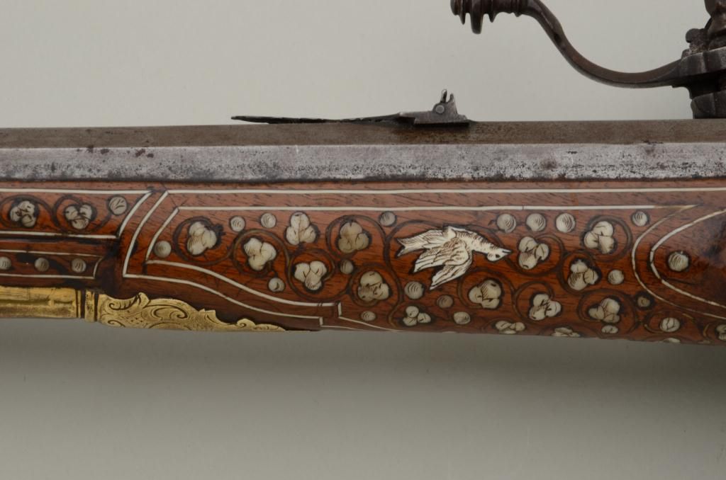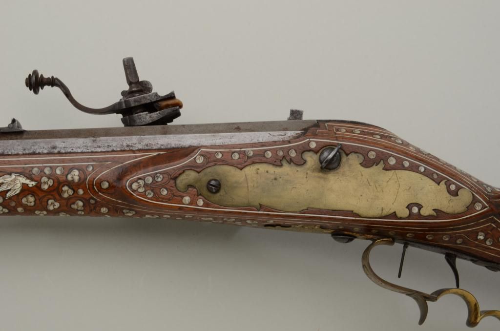 Late Wheelock hunting rifle signed in fancy script initials on lock possibly for one of Zellner family. The rifle measures 45 ½” overall with 31” barrel of approximately .58 caliber. The stock is nicely inlaid in the19th century probably by Spitzer and the brass mounts show traces of original gold gilt and are nicely engraved. There is a beautiful stand of lock arms engraved upon a large plaque inlaid on the right side ofstock. The inlays are 98% plus intact and we could find none missing. The stock is in very good condition with a light coating of spray clear lacquer and the metal surfaces show a light gray to brown patina with somescattered minor light to moderate pitting. The lock plate and hammer are lightly engraved and are in good condition. The lock shows an enclosed wheel of the late era. There is a number on the barrel which appears to be 91 or 97 and that may correspond with the date of Mfg. about 1691-1697. There is a wing screw for removing the lock plate on the left side plate. The interior of the lock is complete and the gun is at least very good