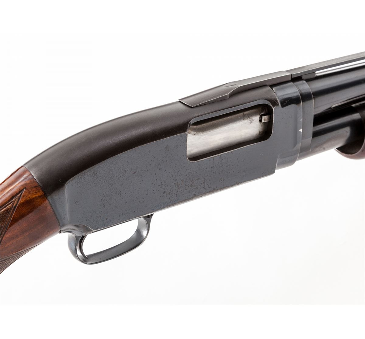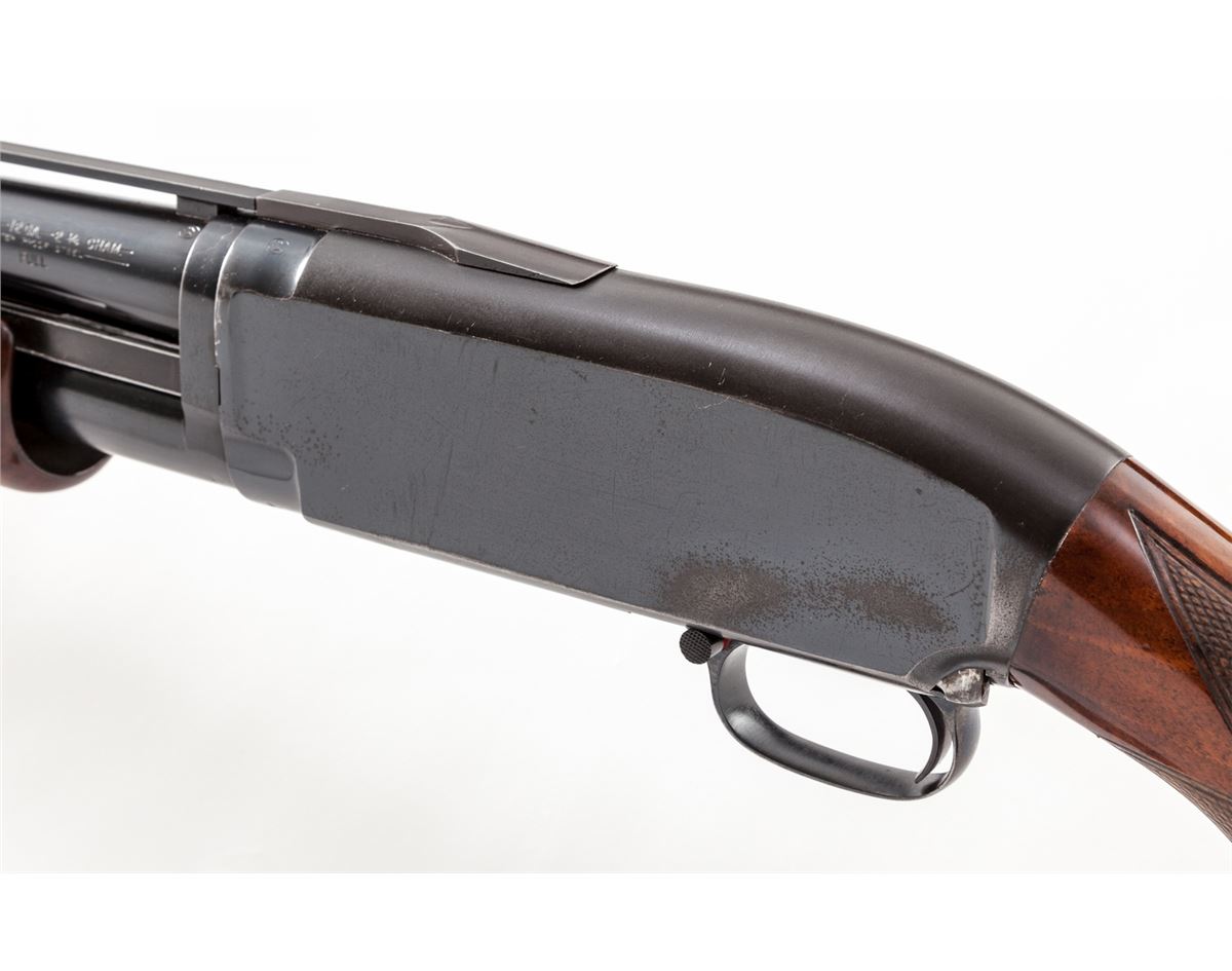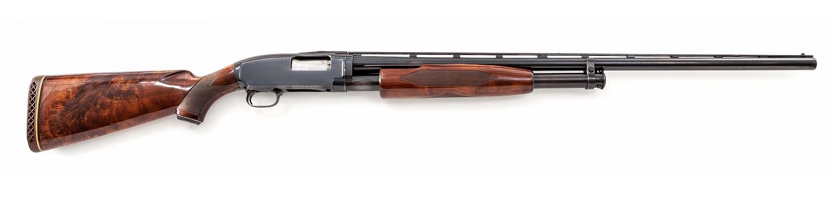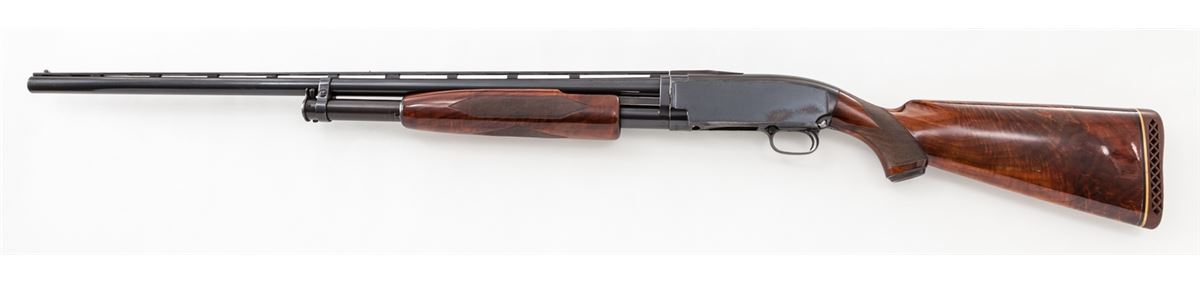 Late Winchester Model 12 Pump Action Trap Shotgun, #1969707, 12 ga., 30'' factory vent rib barrel with 2-3/4'' chamber choked Full, blue finish, fancy pistol-grip checkered walnut stock, with Whiteline rubber butt pad. Mfg'd late 1960s. Condition is fine to near excellent retaining approx. 90% thinning blue, with areas of pitting to both right and left side of receiver flat. Stock and action are excellent, barrel is bright. Est.: $500-$750. (Modern)