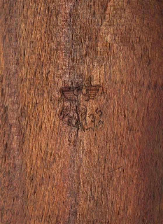 The top of the receiver is marked "MOD98 over byf/45" and the right side has the Mauser factory acceptance proofs. The left side of the barrel and receiver, both have a single eagle firing proof. The rear sight base has been adapted with the dovetail base for the ZF 41 scope mount and scope. This is a late war rifle that has stamped components to include the barrel bands, trigger guard and floorplate, with the trigger guard and floorplate stamped with a "svw" and "byf" proof respectively with both having a single "eagle/135" proof. The barrel bands are screwed on to the stock and are unnumbered and unproofed. The bolt is numbered "8992" on top of the handle and has a "1" proof on the underside. It has the standard K98 front and rear sight with the rear sight graduated from 1-20 (100-2000 meters). It is fitted with the laminated stock and hand guard. The stock has only a single "eagle/135" Waffenamt proof on the right side and is fitted with the late war cupped buttplate. The mount is marked on the rear leg, "eagle 214/duv" with the serial number 87 electro-pencil marked on both scope rings and the mount. The scope is marked "cag/ZF/41/12114" and is missing the rain shields.