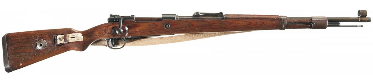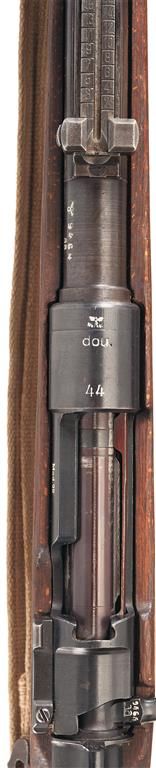 This is a nice original example of a mid 1944 production K98 rifle as manufactured by the BRNO factory in Czechoslovakia. These were the standard bolt action rifle used by all German forces throughout WWII. The receiver is stamped "WaA80/dou/44" with the side wall marked "K98". It has the transitional parts that consist of the unnumbered stamped trigger guard and floor plate with the unmarked milled barrel bands. This example falls into the double letter suffix serial number "9464aa" and has a correct all matching bolt assembly. It is fitted with a laminated handguard and stock that is fitted with a cupped sheet metal buttplate. The stock is numbered "8663" on the underside. It is complete with a front sight cover, rubber muzzle cover, cleaning rod and canvas sling.