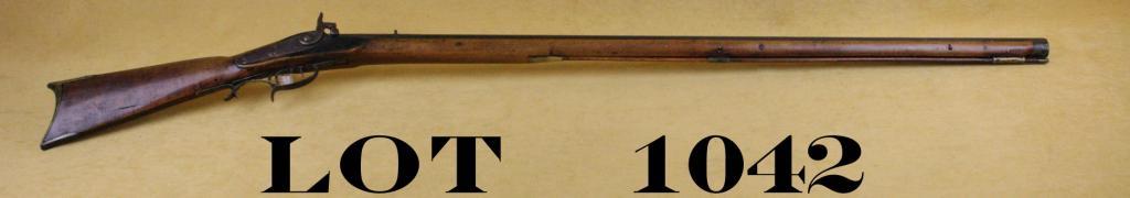 Late full stock percussion "poor boy" Kentucky style rifle with a back-action lock by Ashmore, circa about 1860 in about .40 caliber. The flintlock shows rifled medium weight octagon barrel, double set triggers.Out of the attic and untouched. Action not holding on full cock unless triggers are set. Brown patina on the barrel. Good overall. Est: $350 - $700