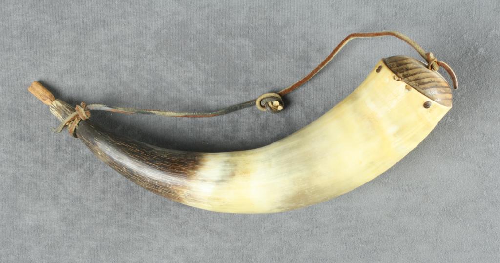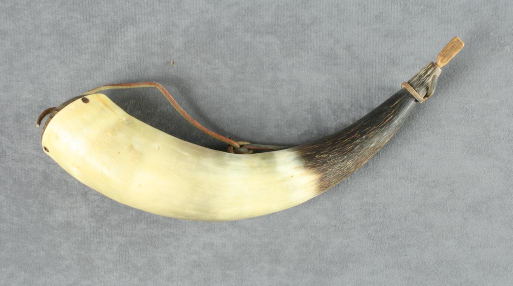 Later large powder horn approx. 13” overall with a wood plug and leather thong for hanging. Est.: $100-$150.