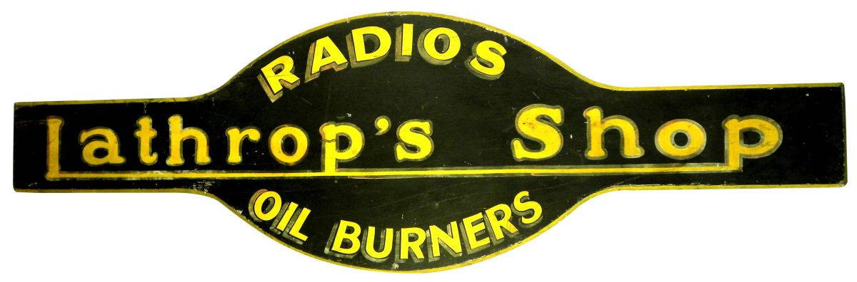 Lathrop's Shop Wood Outdoor Sign. Radios and auto burners. Very good original condition. 67 X 20 1/2 inches.