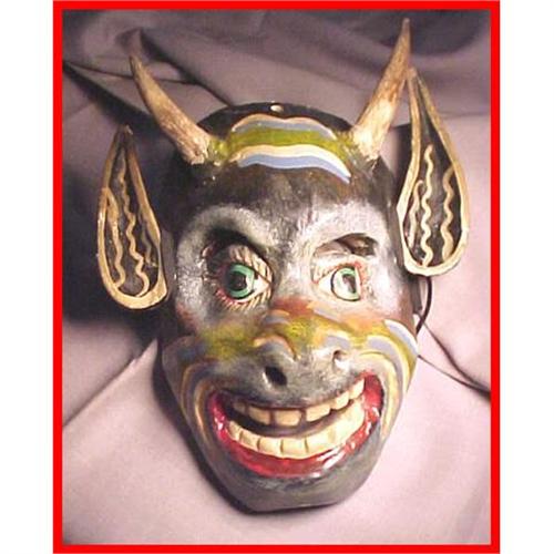 This 11" tall Latin American mask was carved out of wood and painted with polychrome enamels. This devil mask has wood horns. Unknown exact origin and age. Good condition with the typical roughness of Folk Art. I bought this at a local estate sale of an old antique dealer.