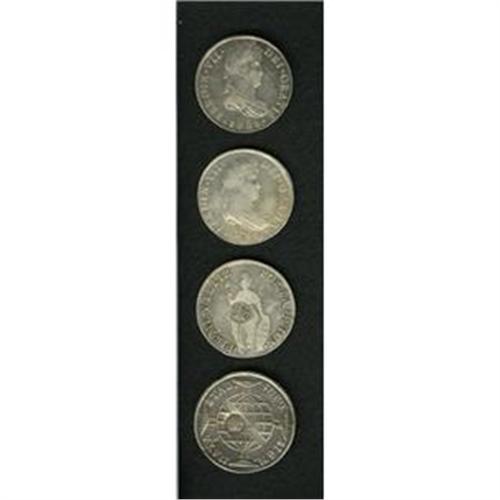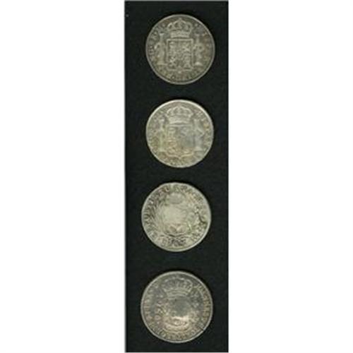 <B>Latin countermarked & "plain" large silver: </B></I>(1)Azores 19th-century counterstamp on Brazilian 960 Reis, 1816, About XF, host coin cracked from the force of the applied stamp; (2) Guatemala 1818 8 Reales, VF+; (3) Guatemala 1821 8 Reales, a striking XF with lovely surfaces and light gray toning; (4) Peru :F.7.0" below crown circular-stamp on 1833 8 Reales, host coin AVF, c/s clear.