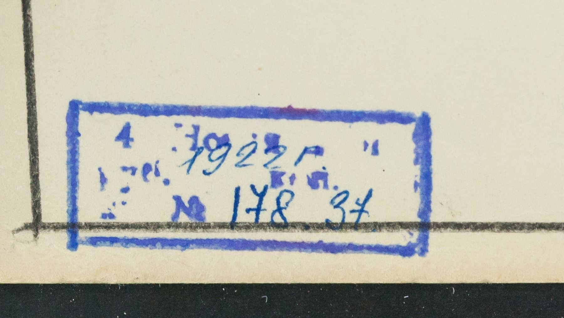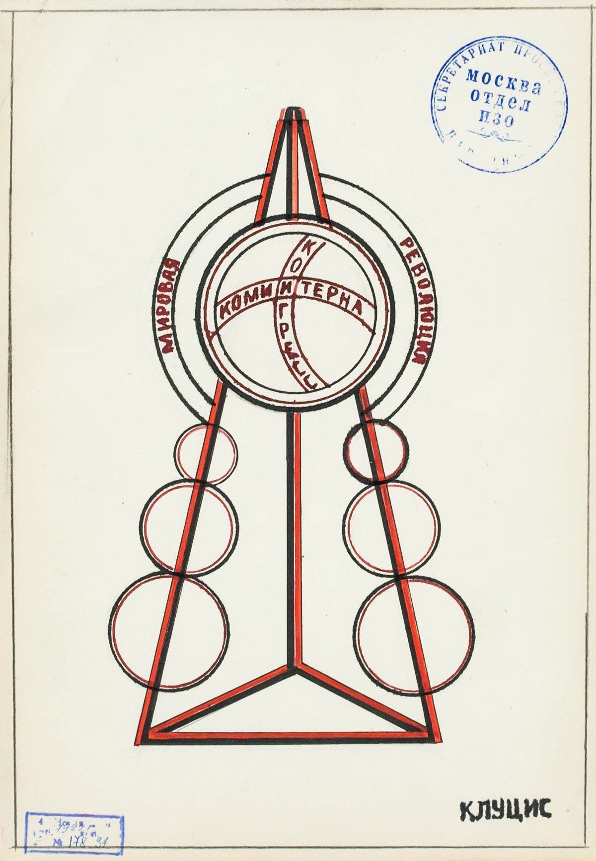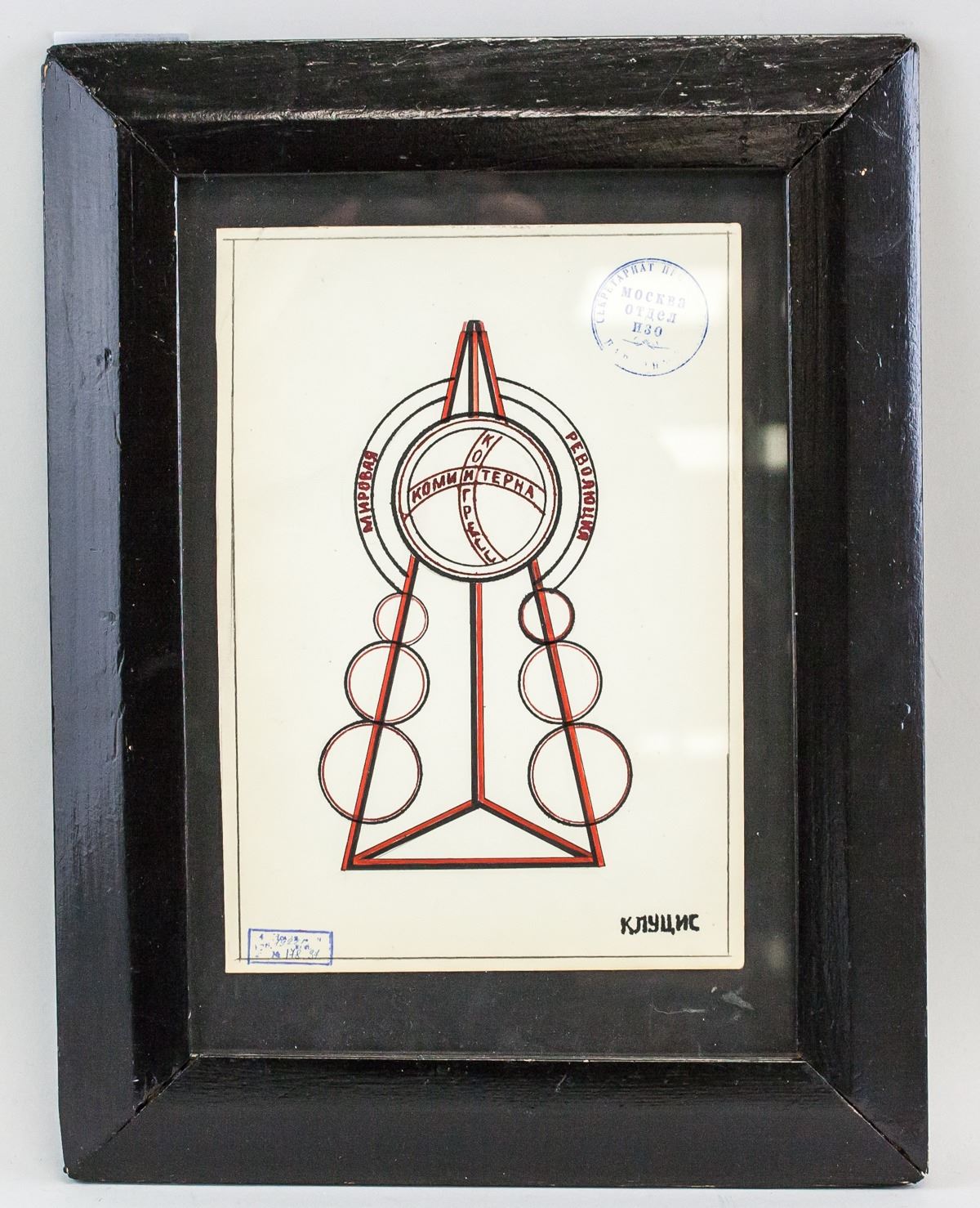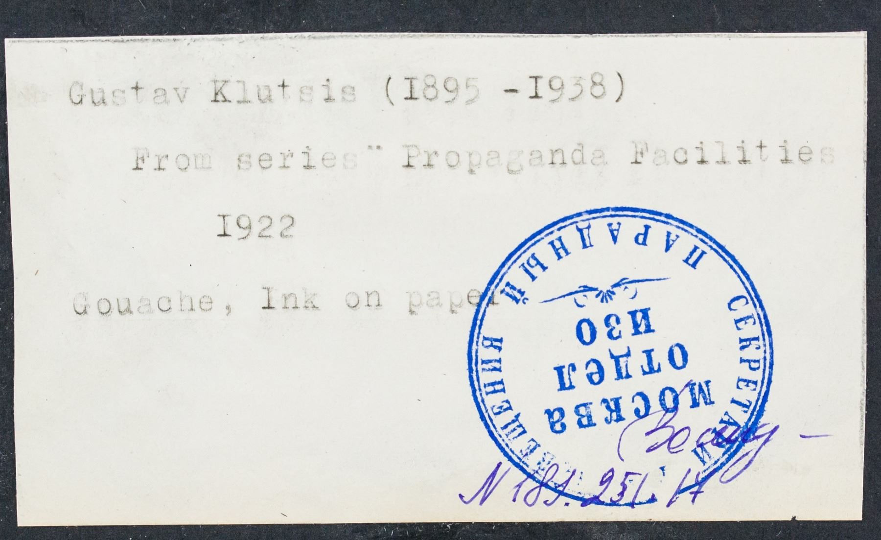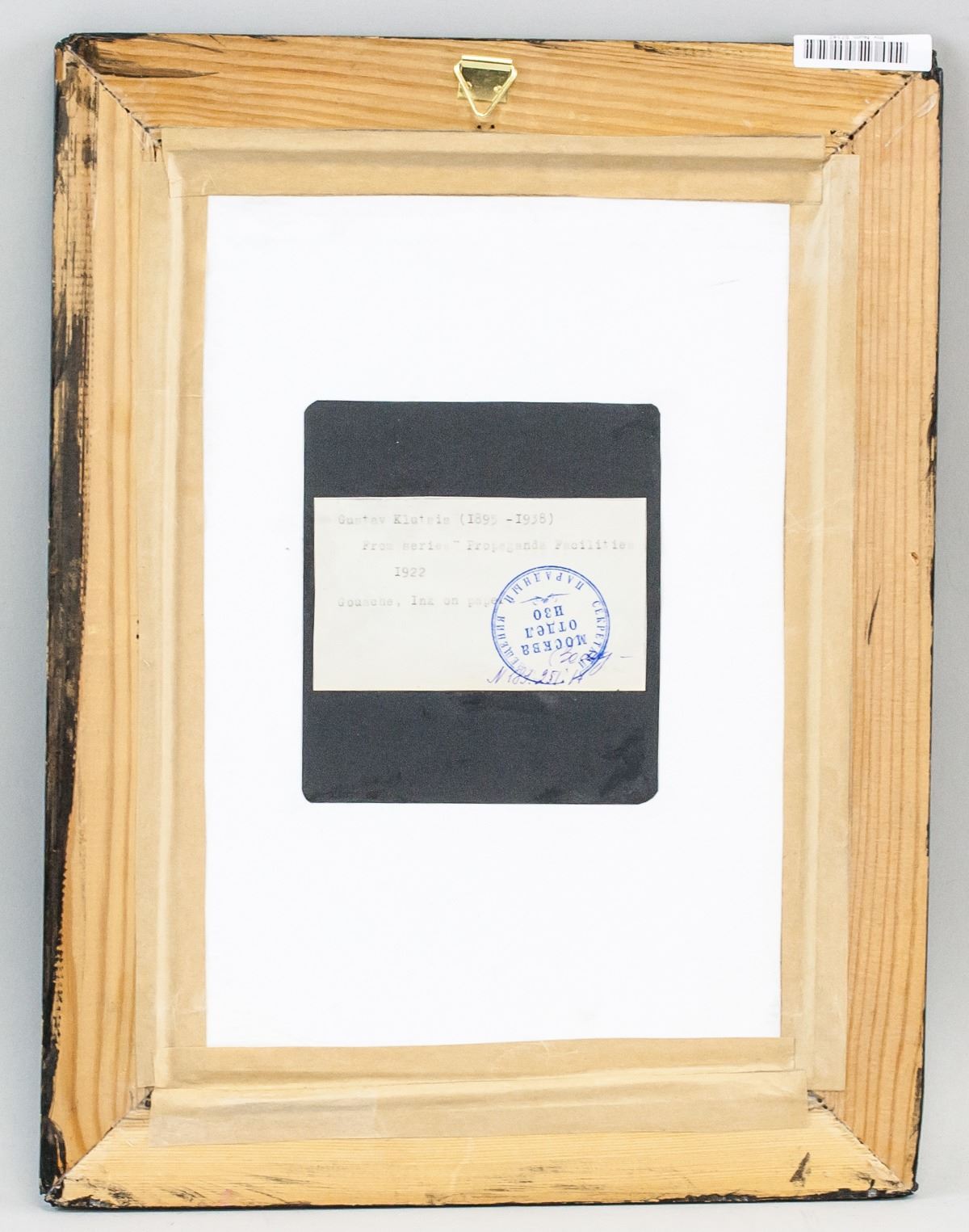 Gouache and in on paper. Featuring an abstract expressionist composition. Signed in Cyrillic on the lower right corner, and stamped on the upper right and lower left corner, respectively. Inscribed 1922r / 178.3f on the lower left corner. Label affixed to verso inscribed Gustav Klutsis (1895-1938) / From series "Progaganda Facilities / 1922 / Gouache, Ink on paper and stamped with inscription N18j. 251.17. 25 x 17 cm (9.5 x 6.7 in), Frame: 38 x 29 cm (15 x 11.5 in)