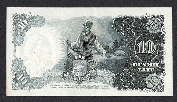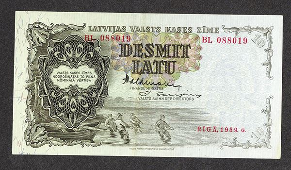Latvia, 10 Latu, P-29, issued, Dark brown and m/c, fisherman at center, XF to Choice XF with 2 light creases keeping the note from AU.