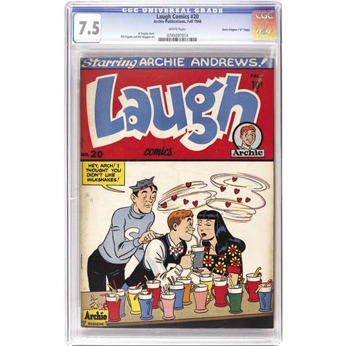 <B>Laugh Comics #20 Davis Crippen ("D" Copy) pedigree (Archie, 1946) CGC VF- 7.5 White pages.</B></I> The title changes from <B>Black Hood</B></I>, and Archie stories and covers (this one by Al Fagaly) begin with this issue. Overstreet 2006 VF 8.0 value = $394. CGC census 7/06: 1 in 7.5, 1 higher. <I>From the Crippen Collection.</B></I> <BR><BR><B>Important notice:</B> Heritage usually auctions material at the rate of 200-250 lots per hour. On some occasions eBay Live bid software or the Internet may not be able to keep up with the pace of the auction. We recommend placing a realistic absentee bid now as insurance to avoid disappointment. Occasionally the auctioneer may eliminate or reject an eBay Live bid, and the auctioneer may also reopen a lot after the close of the eBay live bidding (usually because we missed an audience bid), and may reject your bid even if it shows you as the winning bidder. By bidding via eBay Live, you agree that Heritage may award the lot to another bidder at its sole discretion under the circumstances described above or any other reasonable circumstances. Since eBay bids are not shown to us until we open the lot on the floor, we treat those bids just like floor bids. In most cases the floor responds before the eBay bid is presented to us, due to Internet lag time, so for consistency we have made it a policy that floor bids are always considered first over tie eBay live bids. Also please note that all Heritage lots purchased through eBay Live carry a 22.5% Buyer's Premium. Please make sure you read the Terms and Conditions before you bid. This lot is being auctioned in conjunction with a live floor auction by Heritage Auction Galleries. All final auction and invoice information will be supplied by Heritage Auction Galleries, and all other information should be considered preliminary. Lot:41001 <BR><BR><B>Winning Notification and Billing:</B> After the FINAL session in this auction is complete, Heritage will send e-mail and snail mail invoices. This process normally takes several days. All final auction and invoice information will be supplied by Heritage Auction Galleries, and all other information should be considered preliminary. <BR><BR>This auction will be conducted on a live auction floor and over the Internet through eBay Live. If you choose to place an absentee bid, please take a moment to <font color='#0000ff'><u><a href='http://pages.ebay.com/liveauctions/help/before/laabsentee.html'>learn how eBay Live absentee bidding works</a></u></font><font color='#000000'>