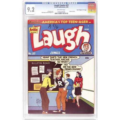 <B>Laugh Comics #27 Davis Crippen ("D" Copy) pedigree (Archie, 1948) CGC NM- 9.2 Off-white pages.</B></I> These earlier Archie issues don't show up in this condition too often! The issue has an Al Fagaly cover, and interior art by Bill Vigoda and Bill Woggon. There are a few lingerie panels inside, by the way! Overstreet 2006 NM- 9.2 value = $220. CGC census 6/06: 1 in 9.2, 1 higher. <I>From the Crippen Collection.</B></I> <BR><BR><B>Important notice:</B> Heritage usually auctions material at the rate of 200-250 lots per hour. On some occasions eBay Live bid software or the Internet may not be able to keep up with the pace of the auction. We recommend placing a realistic absentee bid now as insurance to avoid disappointment. Occasionally the auctioneer may eliminate or reject an eBay Live bid, and the auctioneer may also reopen a lot after the close of the eBay live bidding (usually because we missed an audience bid), and may reject your bid even if it shows you as the winning bidder. By bidding via eBay Live, you agree that Heritage may award the lot to another bidder at its sole discretion under the circumstances described above or any other reasonable circumstances. Since eBay bids are not shown to us until we open the lot on the floor, we treat those bids just like floor bids. In most cases the floor responds before the eBay bid is presented to us, due to Internet lag time, so for consistency we have made it a policy that floor bids are always considered first over tie eBay live bids. Also please note that all Heritage lots purchased through eBay Live carry a 22.5% Buyer's Premium. Please make sure you read the Terms and Conditions before you bid. This lot is being auctioned in conjunction with a live floor auction by Heritage Auction Galleries. All final auction and invoice information will be supplied by Heritage Auction Galleries, and all other information should be considered preliminary. Lot:41001 <BR><BR><B>Winning Notification and Billing:</B> After the FINAL session in this auction is complete, Heritage will send e-mail and snail mail invoices. This process normally takes several days. All final auction and invoice information will be supplied by Heritage Auction Galleries, and all other information should be considered preliminary. <BR><BR>This auction will be conducted on a live auction floor and over the Internet through eBay Live. If you choose to place an absentee bid, please take a moment to <font color='#0000ff'><u><a href='http://pages.ebay.com/liveauctions/help/before/laabsentee.html'>learn how eBay Live absentee bidding works</a></u></font><font color='#000000'>