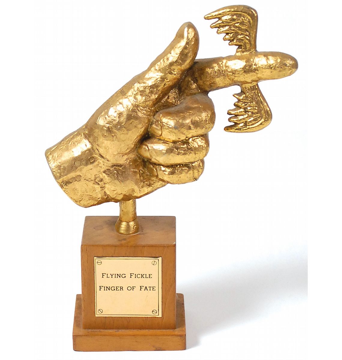 An unusual Flying Fickle Finger of Fate award. Cast base metal ‘finger-with-wings’ statuette, dates from circa 1968, is painted gold and mounted to a wooden base, measures 9.5? tall, with a small presentation plaque on the front. Bottom of base is stamped "George Schlatter and Ed Friendly promotions and Romart, 1969, Invento Products." In fine condition, with some scattered light surface wear to plaque. This weekly satirical award was presented by comedians Dan Rowan and Dick Martin on Laugh In for the craziest news item of the week. These particular awards were sold in stores at the same time the show ran on television and have become quite collectible.