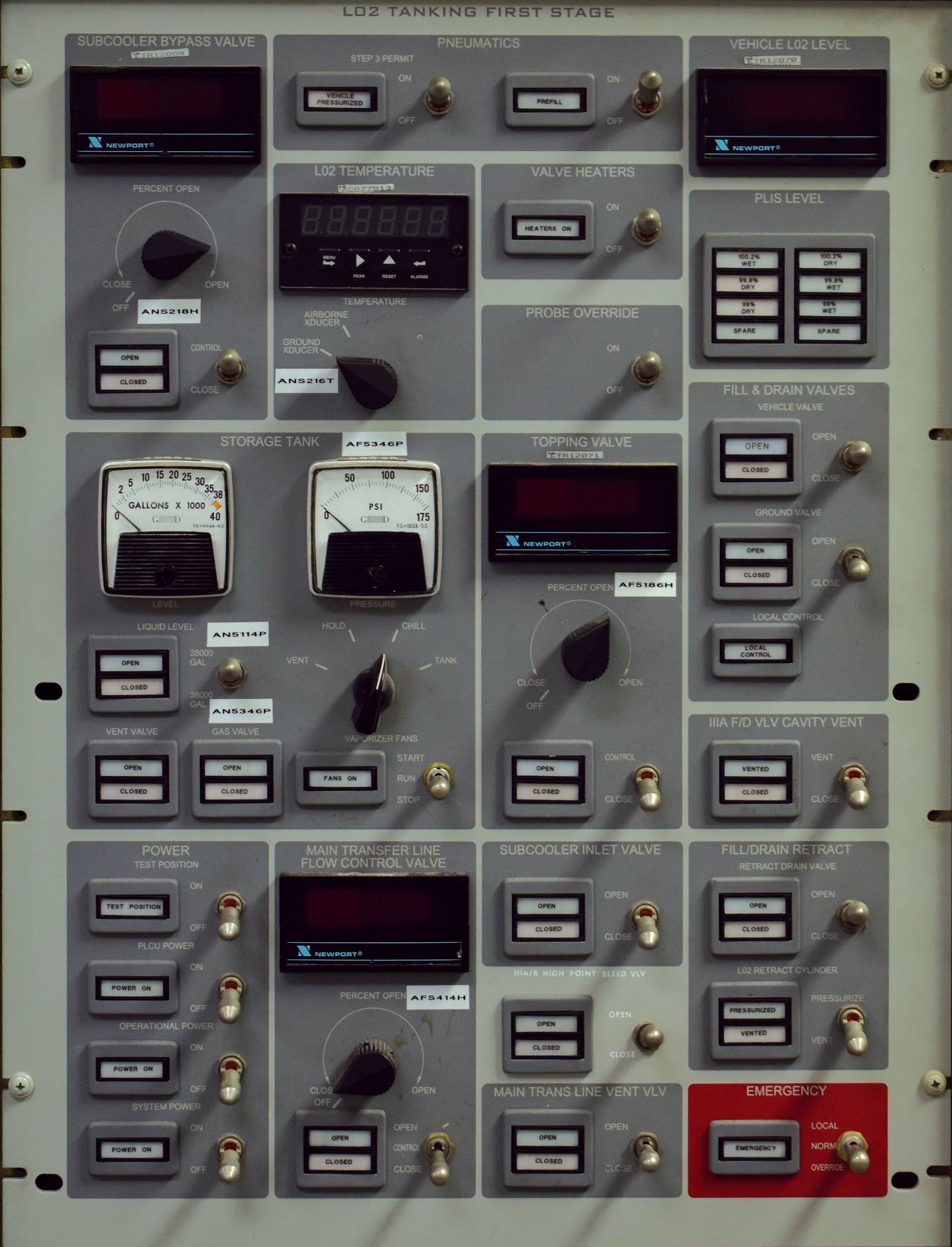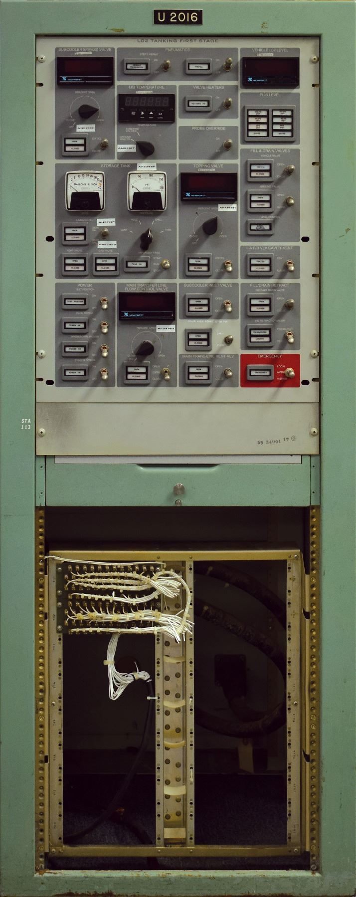 Liquid Oxygen First Stage Tanking Cabinet from Launch Complex 36B, which was first installed in 1962 and removed August 2005, used for a total of 76 Atlas/Centaur launches during its years of service. The unit measures an overall 24 x 60 x 26 and weighs 200–300 pounds, and has a tag at the top reading "U2016." This is the original cabinet that was installed in 1962, with some indicator modifications in later years to include digital readouts. It features a pullout work drawer with lift-top surface for storage below. The power supply (which would weigh over 100 pounds by itself) was removed, and likely reused, as was the headset/communication panel which would have been just above the drawer. The cabinet could be wired up so that the lights and switches function for display purposes. In fine condition. Accompanied by an original color 10 x 8 NASA press photo from 1986 showing the inside of the blockhouse at Complex 36 for the Atlas/Centaur-66 launch, a 1992 USAF photo of an Atlas rocket at Complex 36B, and five other original photos of either Atlas/Centaur launches or the interior of the Launch Complex blockhouse, as well as a 2001 Lockheed Martin procedural booklet entitled "Complex 36B Tankwatch Instructions." From the collection of aerospace memorabilia specialist Ken Havekotte. The prolific Atlas-Centaur expendable launch system was in use from 1962 to 2004, a remarkable length of time for any piece of technology.