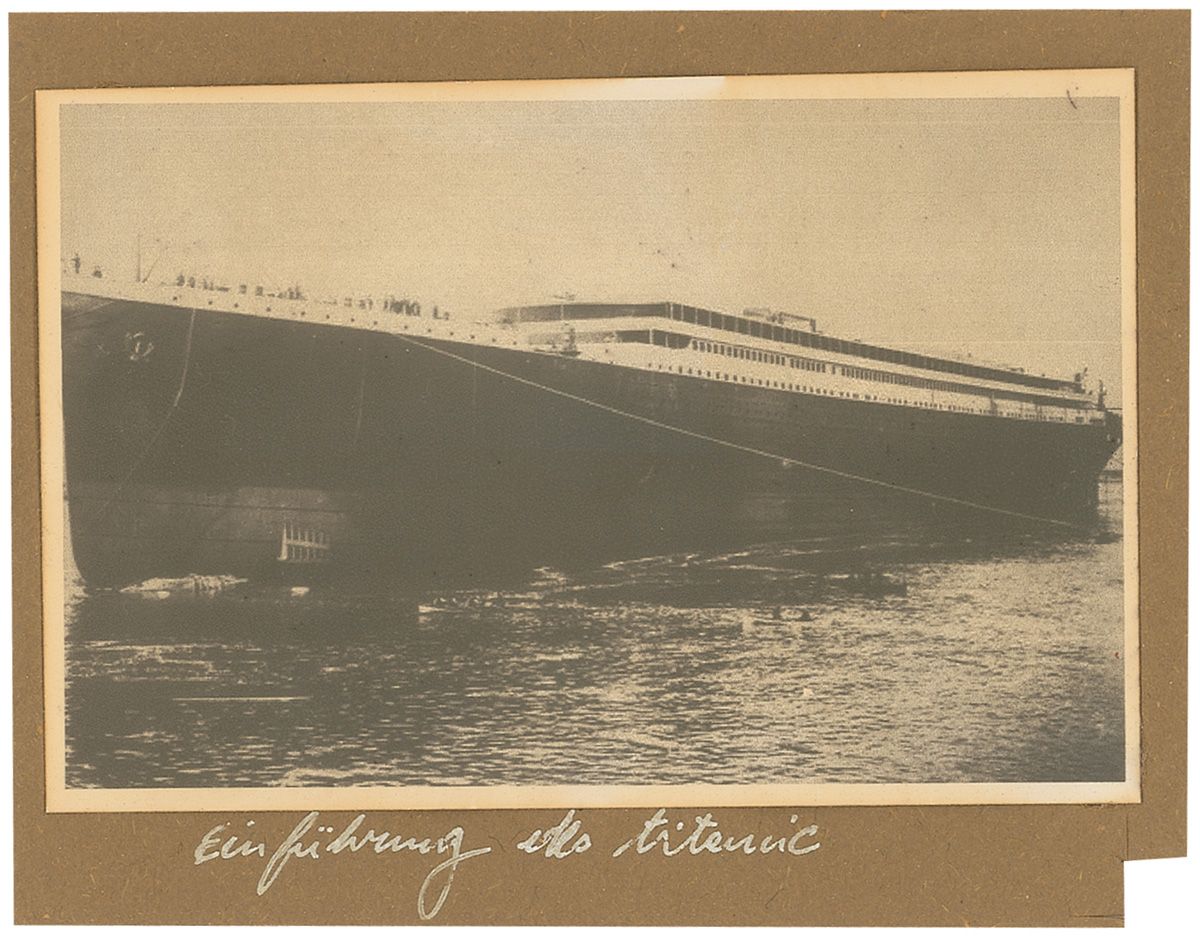 Original matte-finish 4.25 x 2.75 photo of the launch of the Titanic, affixed to a slightly larger sheet and captioned in German. In fine condition, with light scattered toning. Removed from an original scrapbook containing other period Titanic photographs.