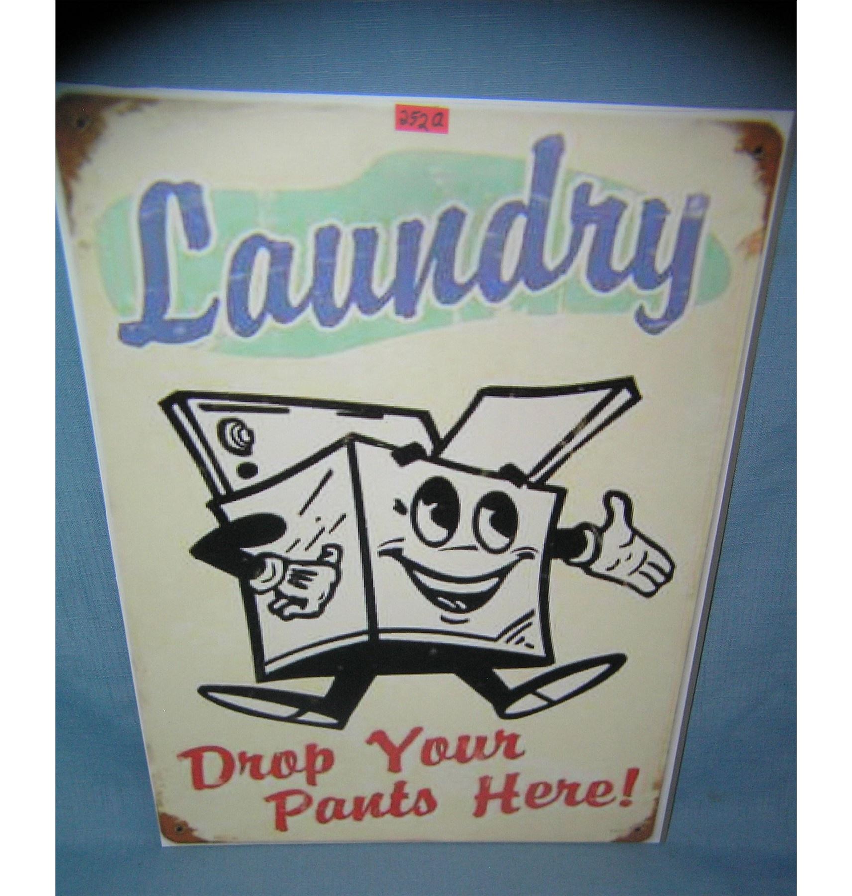 Laundry drop your pants here retro style advertising sign 12 inches by 16 inches on board est. value $40.00-$50.00