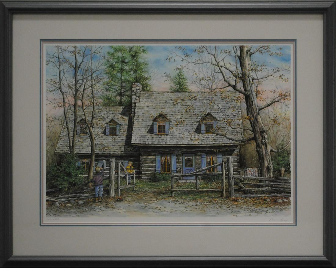 Laura Berry's "Fallen Leaves" limited edition print signed and numbered 301/390. This has been professionally triple matted using acid free matting and acid free foam core, and has been custom framed under glass. Image- 17 1/2" x 25". Frame- 27 1/4" x 34 1/4".