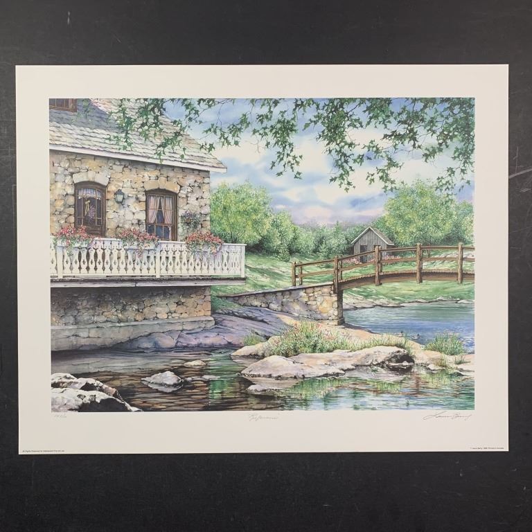 Laura Berry's "Reflections" limited edition print, signed lower right, titled lower middle, and numbered PP 5/10 lower left. This piece is of a scene of the outside of a home, which rests at the water's edge, with a small walking bridge in the midground. This piece is in mint condition, and is included in its original folger from the publisher.