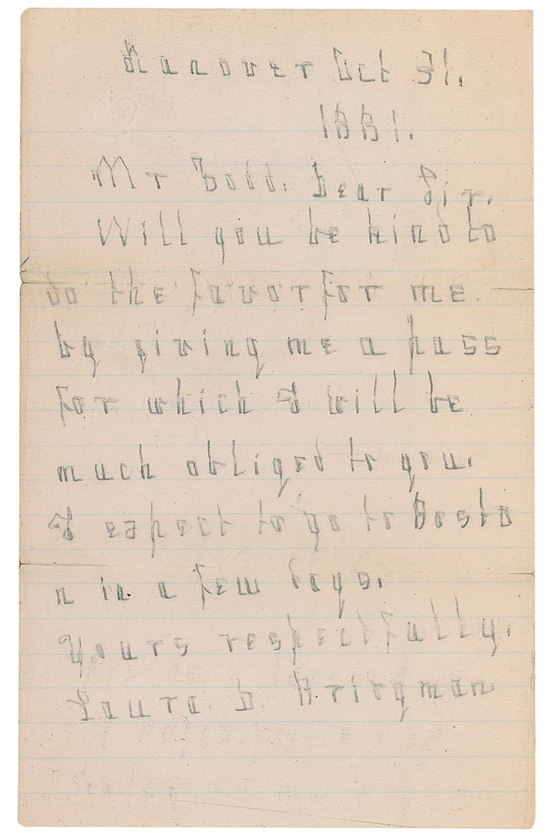 New Hampshire born personality (1829–1889) who was the first deaf-blind American person to learn to communicate in the English language. ALS signed “Laura B. Bridgman,” one page, lightly-lined, 4.5 x 7, October 31, 1881. Letter to a gentleman. In part: “Will you be kind to do the favor for me by giving me a pass for which I will be much obliged to you.” In very good condition, with repaired separations to reverse of horizontal folds, a few wrinkles, and uniform toning.