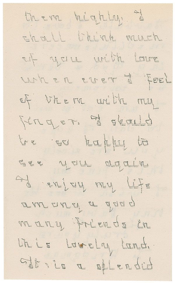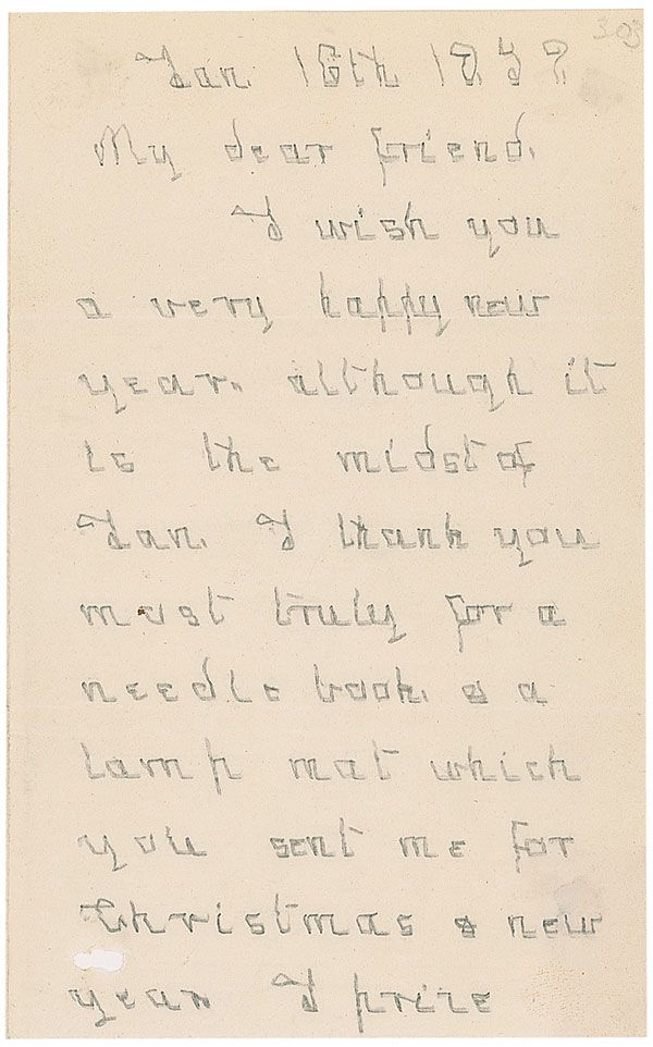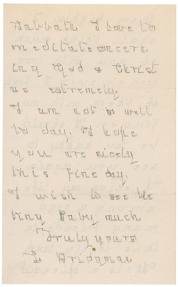 New Hampshire born personality (1829–1889) who was the first deaf-blind American person to learn to communicate in the English language. ALS signed “L. Bridgman,” three pages on two adjoining sheets, 4 x 6.75, January 18, 1849. In part: “I thank you most truly for a needle book & lamp mat which you sent me for Christmas & New Year. I prize them highly. I shall think much of you with love when ever I feel of them with my finger.” In fine condition, with a small hole to the lower left corner of the first page, and some show-through from mounting remnants.